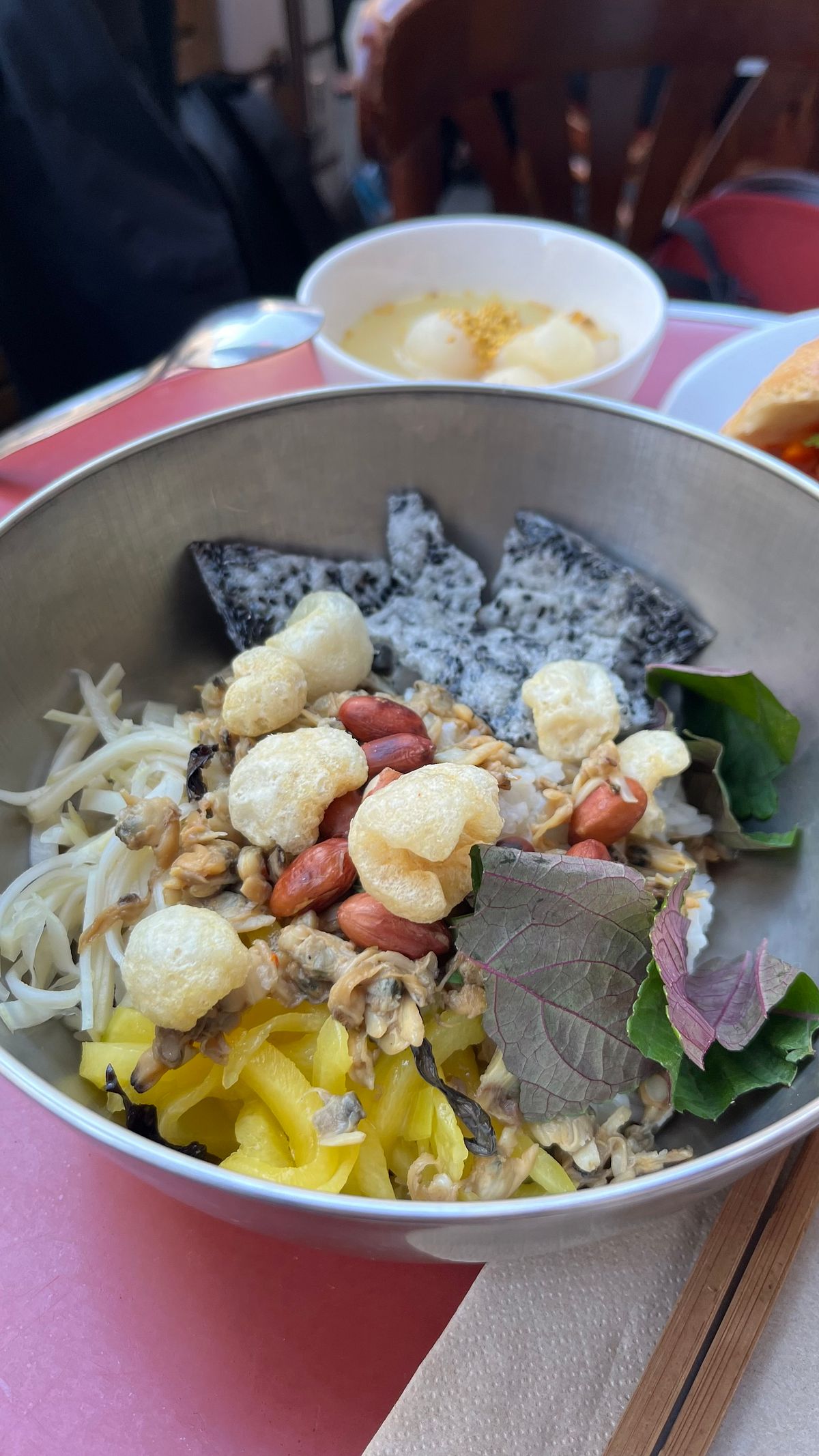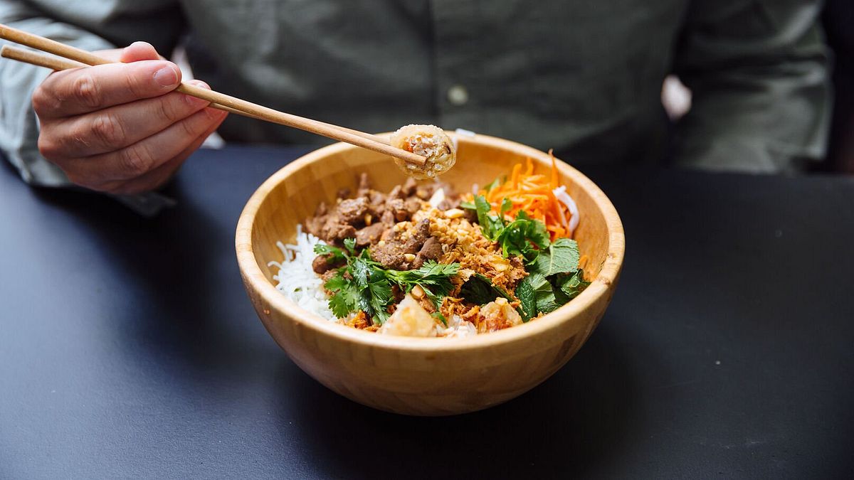 As someone who has only heard of bún bò, and never bò bún, I was a bit confused. Bò bún is a bowl of rice vermicelli noodles topped with stir-fried lemongrass beef, lettuce, cucumber, mint, cilantro, bean sprouts, pickled carrots, roasted peanuts, and a fried eggroll — which is called “nem” in French, after the northern term, instead of the southern “chả giò.” Bò bún is served with nước chấm. In Vietnam, we would call this dish bún bò Nam Bộ, bún bò xào, or bún thịt bò xào. Why the name was flipped in France remains unknown, but it's a mystery many of us would like to understand.