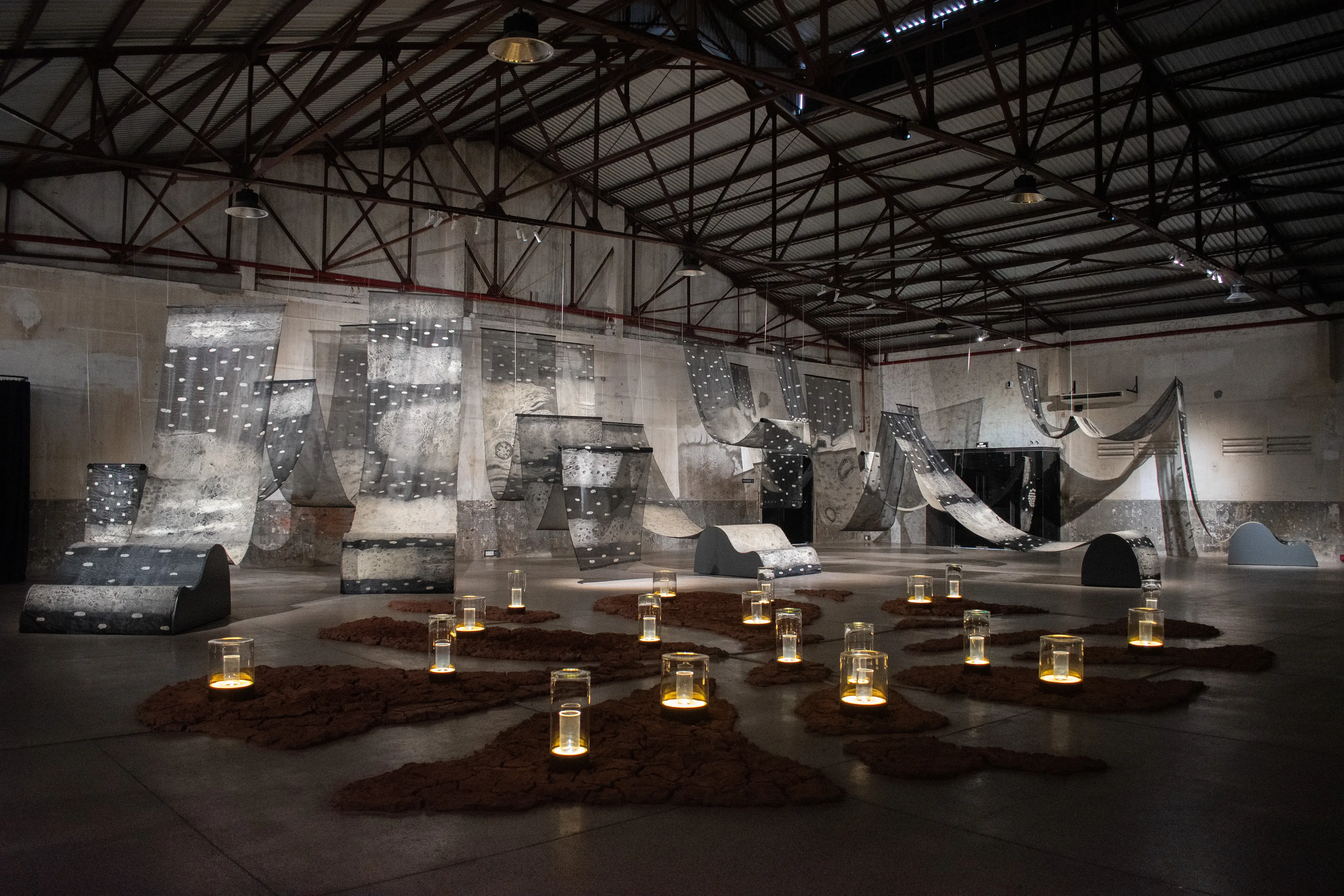 Darkness fills the space and a flame fiercely burns on the large screen, while dim lights and floating fabric linger behind. Ngô Đình Bảo Châu transforms domestic and bodily forms into works that explore the interconnectedness between the human body and the surrounding environment within this evolving world — in between destruction and rebirth.