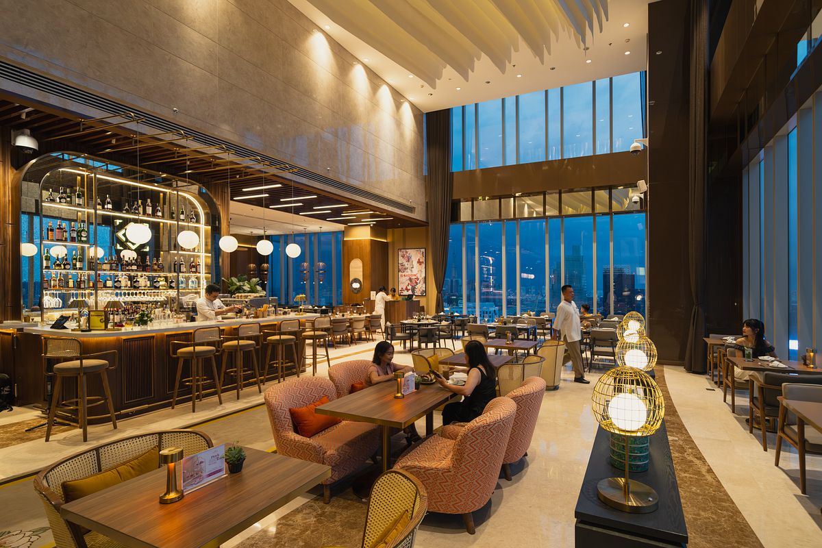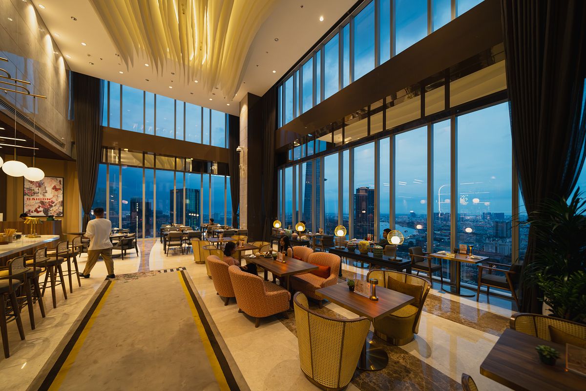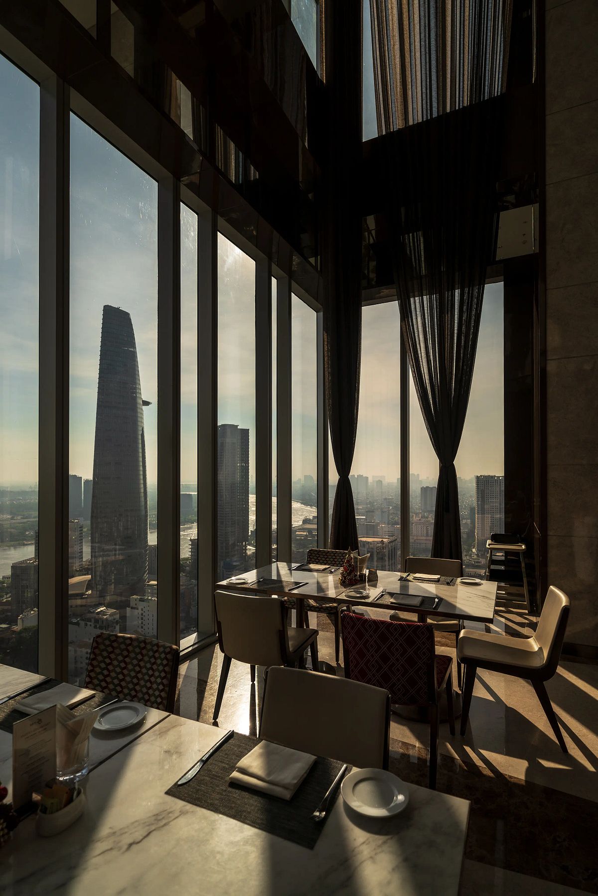 The Straits sprawls out in front of you as you exit the elevator, the spacious room expanding to floor-to-ceiling windows that overlook the Saigon River in one direction and past Landmark 81 and the seemingly endless scramble of development that constitutes central Saigon in the other. Plush couches invite you to rest, recline, and meet with friends in what could be the day’s first moment of true relaxation. In the center of the room are similarly comfortable chairs around tables with The Straits’ sleek, brightly lit bar behind.