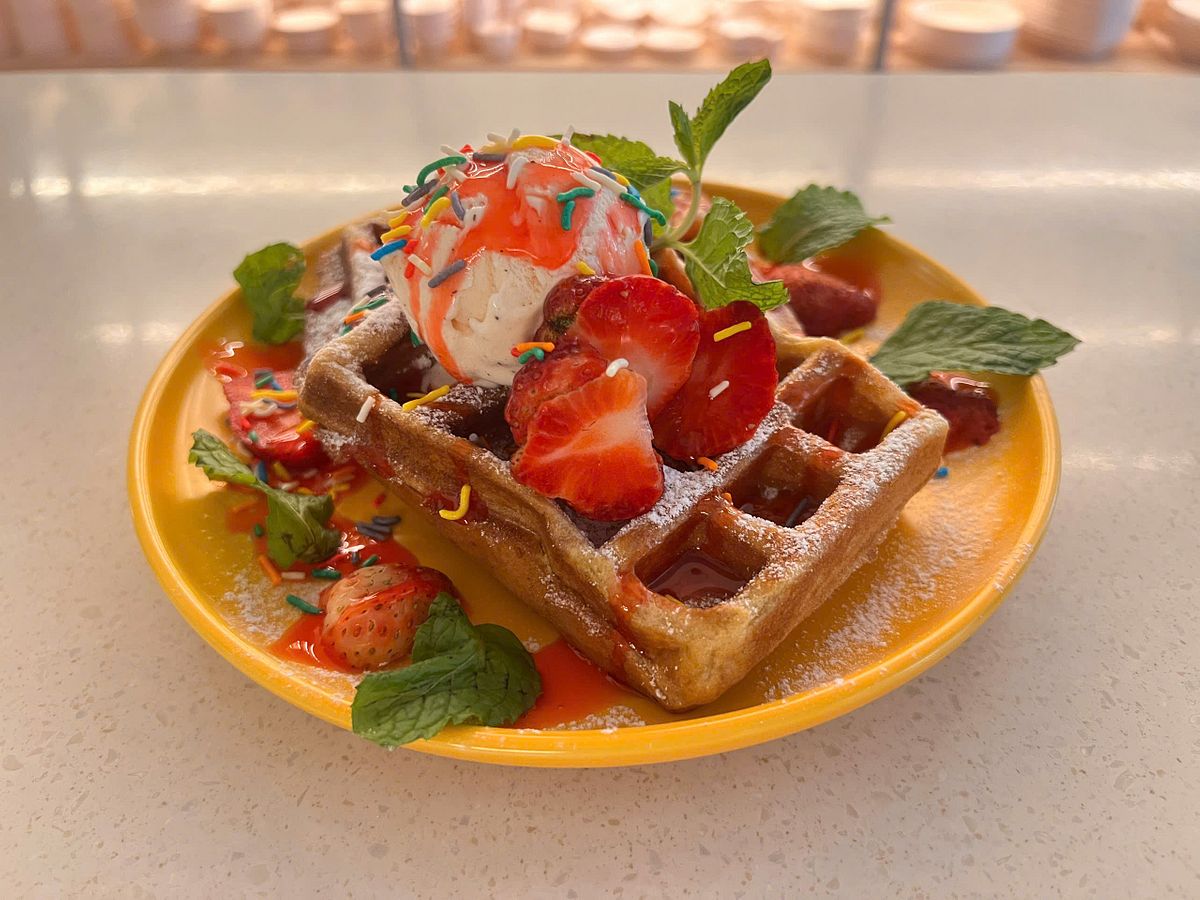 While sponging abstract colors, stenciling delicate flowers or even printing a beloved pet’s paw on a dish, it’s nice to enjoy some refreshments. The same commitment to quality that informs the ceramics applies to the cafe’s drinks and waffles. Fresh fruit means that no added sugar is needed for the juice while only real butter and maple syrup are used for the waffles.