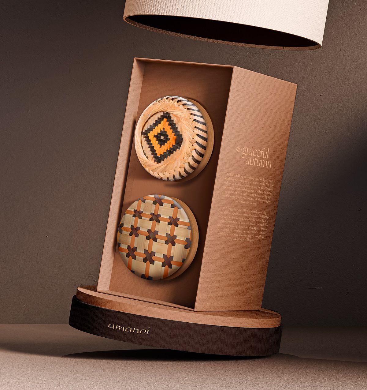 Embodying the spirit of “Sense of Place” - refined, minimalist, and deeply rooted in locality, the mooncake box design draws inspiration from the traditional fishing basket, a timeless symbol of coastal life. Reimagined as soft, flowing waves of Vinh Hy, this motif captures the bay’s gentle rhythm in poetic form. The box itself is presented in two layers: the outer sleeve, crafted from pressed paper and sculpted into graceful curves, evokes the human hand in harmony with nature; beneath it lies the inner tableau, a panoramic depiction of the bay, Nui Chua, the sea, and Amanoi - a scene of grandeur, purity, and harmony. The inner box is handcrafted using traditional bamboo, making it not only a gift of aesthetic beauty but also a reflection of Amanoi’s enduring commitment to sustainability.