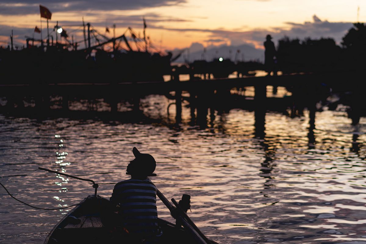 After you cross the Cửa Đại Bridge leading away from Old Town, you’ll turn into a warren of homes and notice the first signs of activity. A few motorbikes rumble in the distance, some homes have lights on, and finally, on the tiny streets that lead to the water, small restaurants and coffee shops emerge, brightly lit against the lampblack dark. In a simple wooden-walled shop playing bolero, middle-aged men slap playing cards onto plastic tables filled with phin filters and drinking glasses. Their workdays are already over and it is time to relax now that they are back on firm ground. At the docks, women are just beginning to work as sanguine light clots on the horizon.