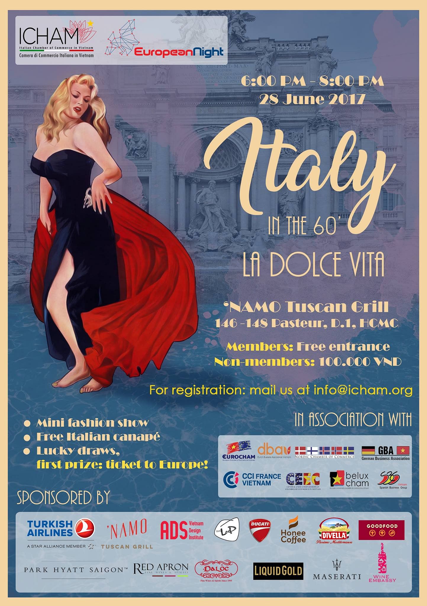 We are pleased to inform you that the 1st edition of European Night - previously known as NetPlus - will be hosted by the Italian Chamber Of Commerce In Vietnam with the theme "Italy in the 60s: LA DOLCE VITA" at one of the best Italian restaurant 'NAMO Tuscan Grill.