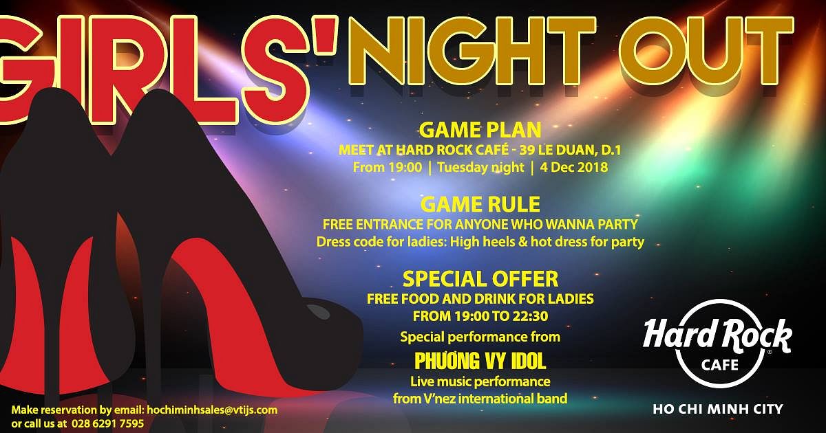 Hey ladies, head up to Hard Rock Café Ho Chi Minh City on Tuesday,December 4th, 2018 at 19:00 for ultimate GIRLS' NIGHT OUT party.