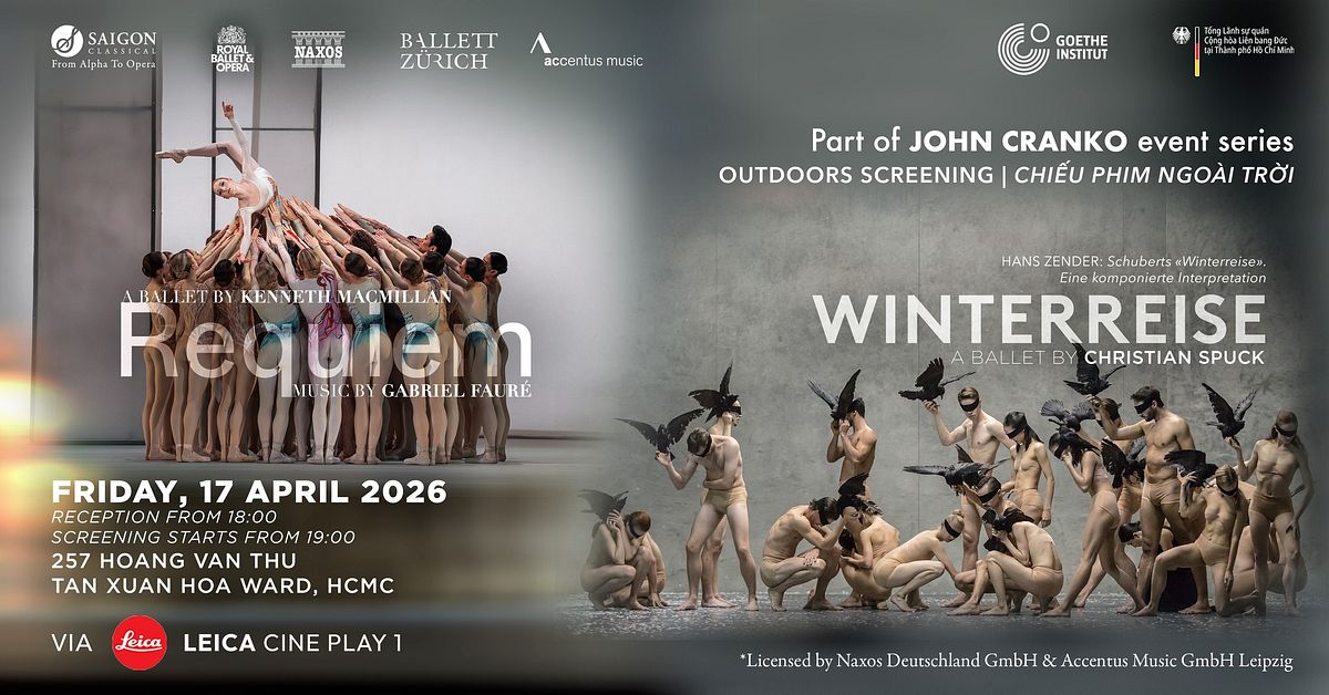 This screening has been granted licence by rights holder Naxos Rights (Europe), Ltd., on behalf of the Royal Opera House, Covent Garden (for REQUIEM Fauré / MacMillan) and Accentus Music GmbH Leipzig, on behalf of Opernhaus Zürich (for WINTERREISE Schubert / Zender / Spuck) to From Alpha to Opera project, in partnership with Saigon Classical Music Group. Licensing fees are supported by Goethe-Institut Ho Chi Minh City.