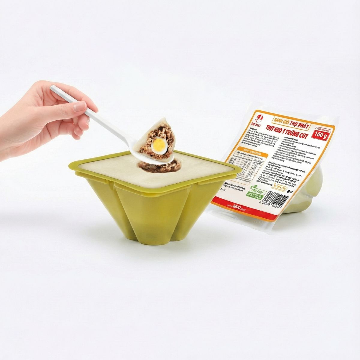 In December 2025, the company announced that it would sunset the old leaf-wrapped bánh giò version and switch to a new plastic mold, effective immediately. The reasons given included improved hygiene, convenience, and shelf life. The plastic version retains the pyramidal silhouette, and similar food filling, with a meagre banana leaf square at the bottom that can fit neatly in the palm of my hand. I personally think the mass-produced version, leaf or plastic, has never held a candle to bánh giò by independent makers, but it has taken a turn for the worse after the removal of leaves. Their grassy aroma contributes significantly to the eating experience and their broad surface helps the content retain moisture; without leaves, the dough is stodgy, monotonous, and miserable.