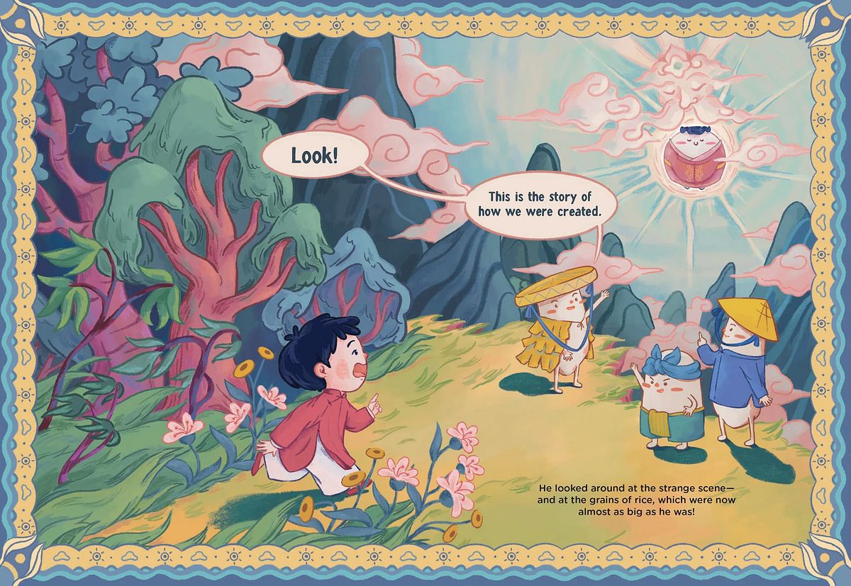 In the story, Minh, the protagonist, refuses to finish his rice bowl and thus deeply offends the magic rice grains, prompting them to take him on an adventure to learn about how rice is made and how it should be appreciated. Some details in the book are connected to Vietnam's folk belief that rice was given to humans by the gods in heaven. In addition, this book makes an effort to maintain cultural authenticity by including many Vietnamese elements, such as proverbs that play a crucial role in detailing the process of making rice. According to Quỳnh, the creators fought to keep them in the book’s English edition: “Readers from American culture don’t know and understand much about Vietnamese proverbs. It took us a whole year to convince the publishing house to keep them, because they are the core of our story.”