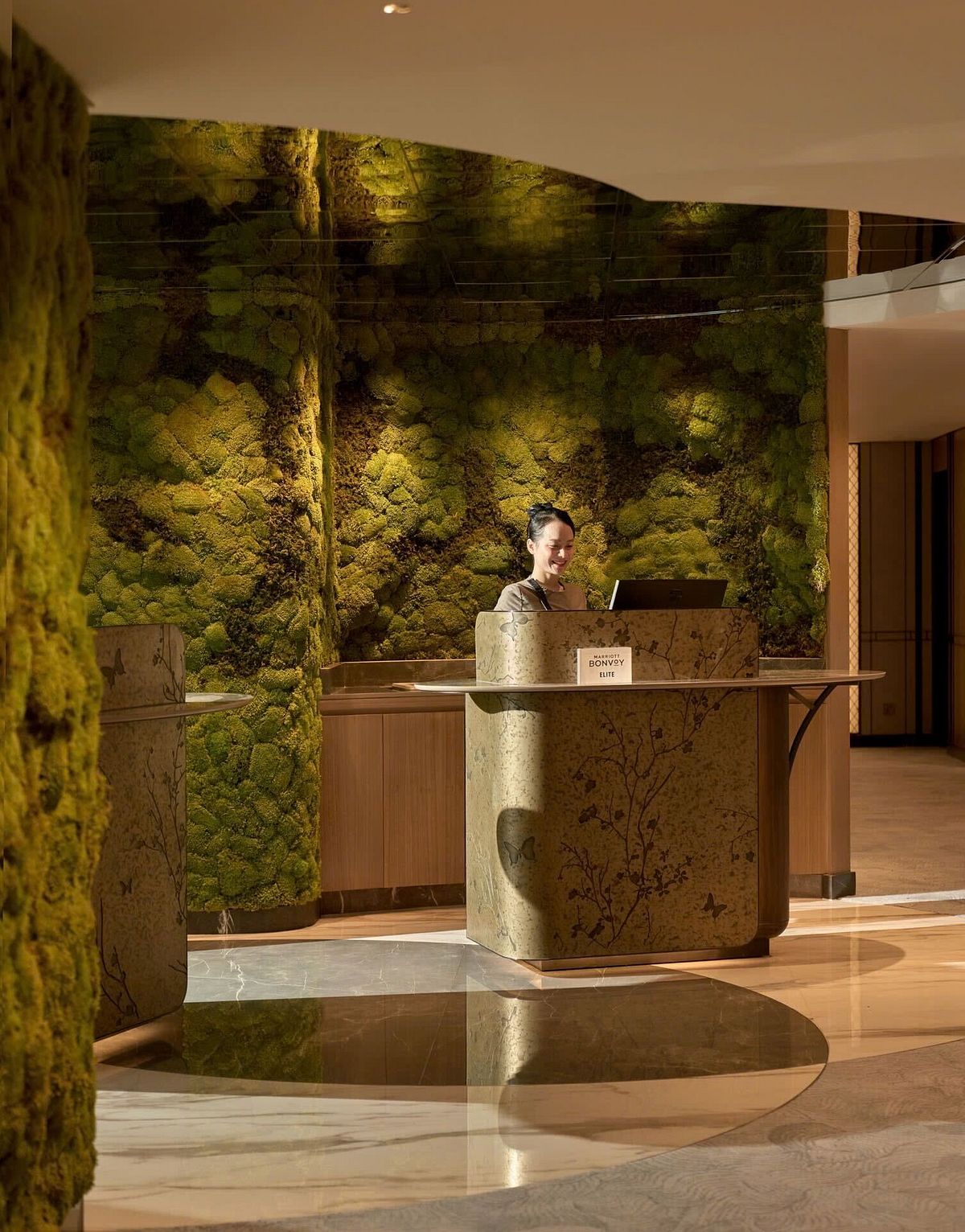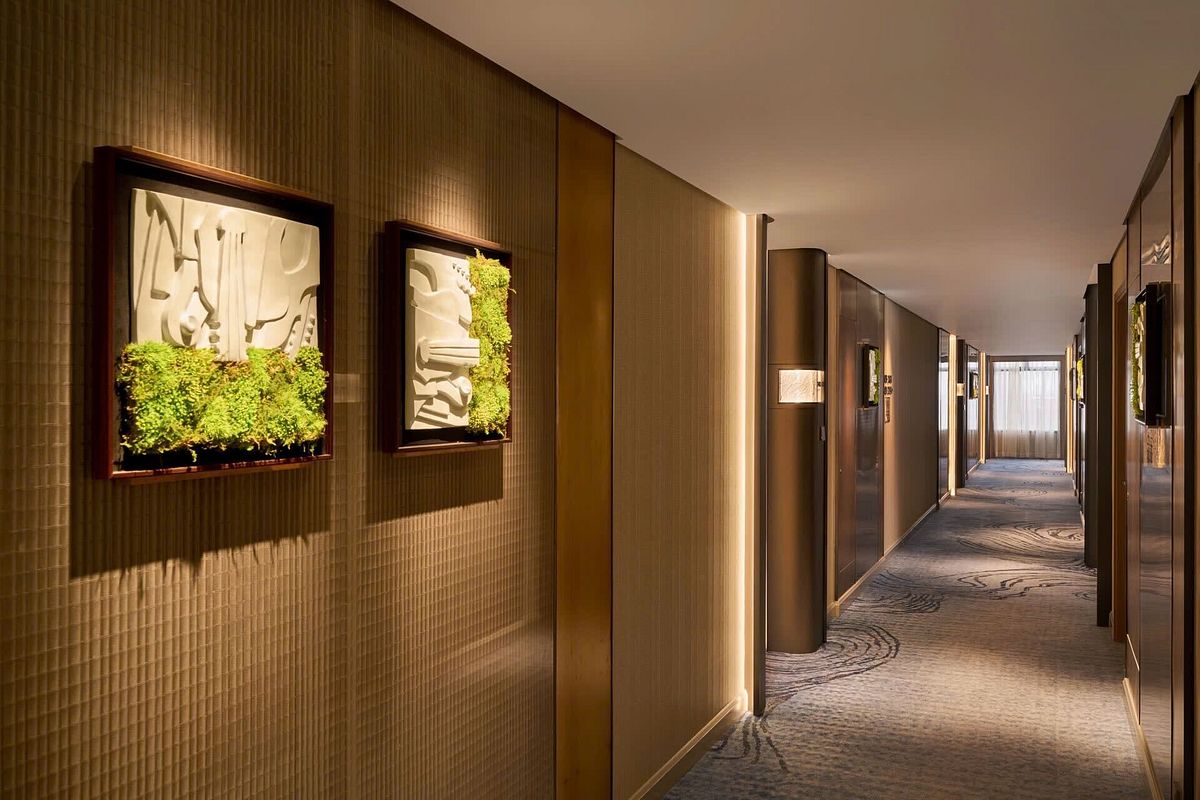 Sự hòa hợp ấy thể hiện ngay từ những chi tiết đầu tiên: ánh đồng óng ả của tấm khảm tại sảnh như ánh đèn sân khấu chạm vào màn nhung; mảng tường đen bên cạnh tạo cảm giác như phút lặng im trước giờ mở màn; bức phác họa nhà hát đặt ngay lối vào thang máy như mở đầu cho hành trình khám phá thành phố của khách lưu trú. Tiếp nối cho chuỗi cảm hứng thị giác đầy mỹ cảm ấy là bức ảnh nhà hát dưới trời sao huyền diệu trong không gian thang máy, lời gọi mời không thể chối từ về một chốn lưu trú sang trọng, nơi hội ngộ giữa Đông-Tây, kim cổ giao hoà.