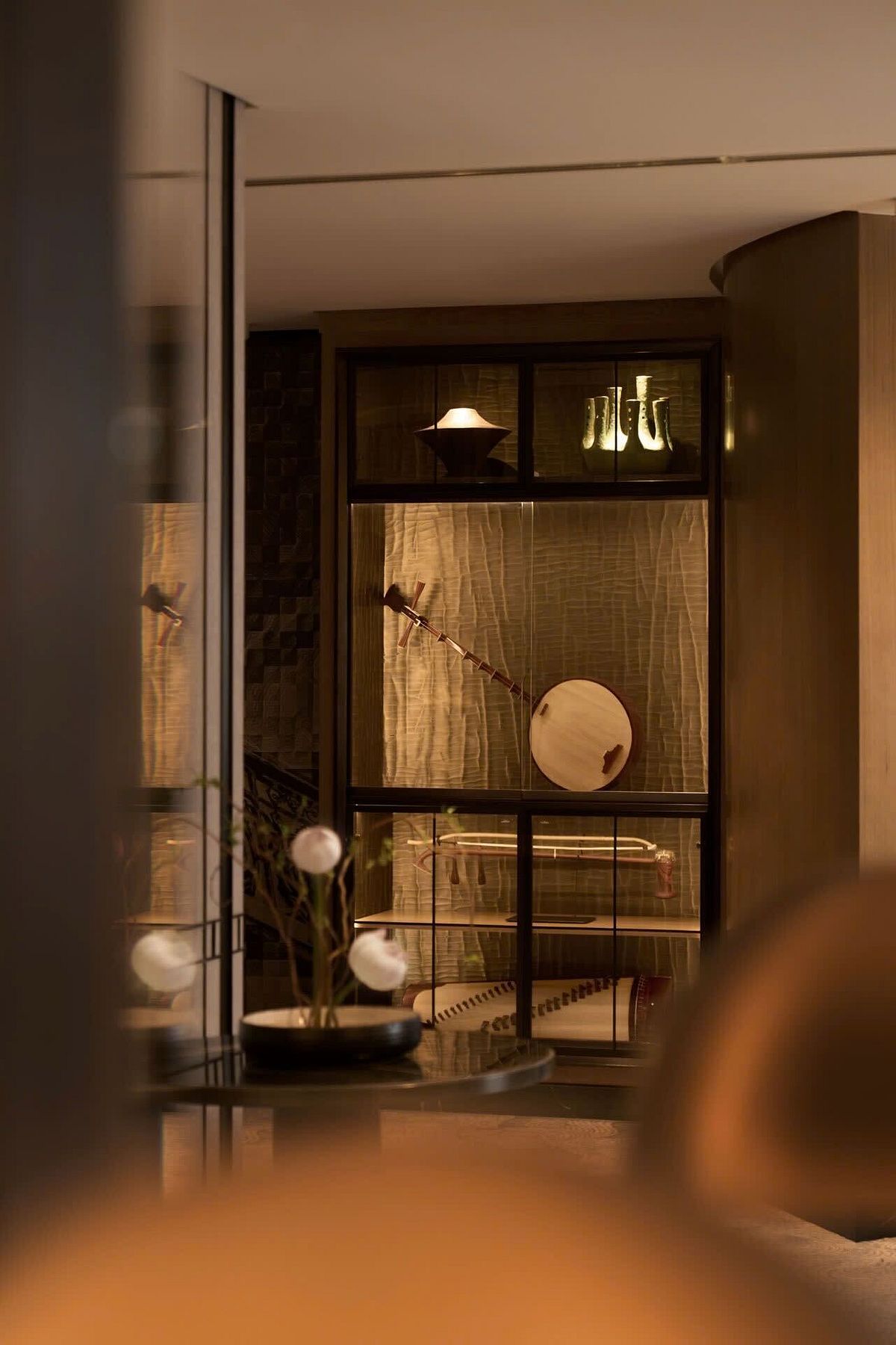 Ngay cả trong từng căn phòng, điều đó cũng được tiếp nối qua những lựa chọn thiết kế mang tính tĩnh tại và có chủ đích. Tủ gỗ bo tròn khảm xà cừ như gợi lại nghề sơn mài, những vật dụng đa chức năng như tranh trang trí ẩn giấu chiếc gương soi hay bàn làm việc tích hợp bàn trang điểm đem lại cảm giác tinh giản mà hiệu quả, còn ánh sáng được tính toán hoàn hảo để đem đến sự thư giãn tuyệt đối.