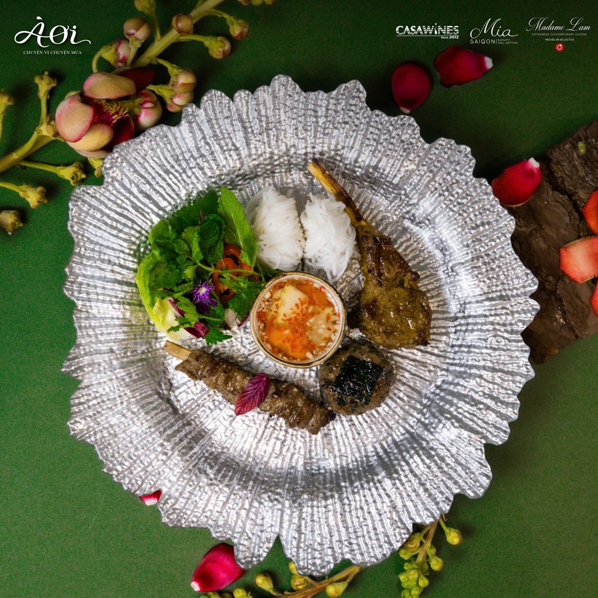 Nếu ‘Hương rừng ướp biển’ là một nốt hương tuyệt đẹp mang dấu ấn nguyên liệu từ vùng biển quê hương của bếp trưởng Như Cường thì Bún chả cừu là một tuyệt phẩm ‘Đông Tây bừng vị’ với sự thăng hoa đầy cảm xúc từ vị nhớ Hà Nội, mang âm hưởng ‘món ngon quê mẹ’ của bếp trưởng Daniel Nguyễn. Món bún chả quen thuộc được làm mới thật ấn tượng với Sườn cừu và chả cừu nướng ăm kèm bún tươi và rau thơm kết hợp với loại sốt đặc biệt từ riềng, mẻ và mắm tôm mang đến kết cấu hoàn hảo khiến vị giác được ngao du qua những tầng hương.