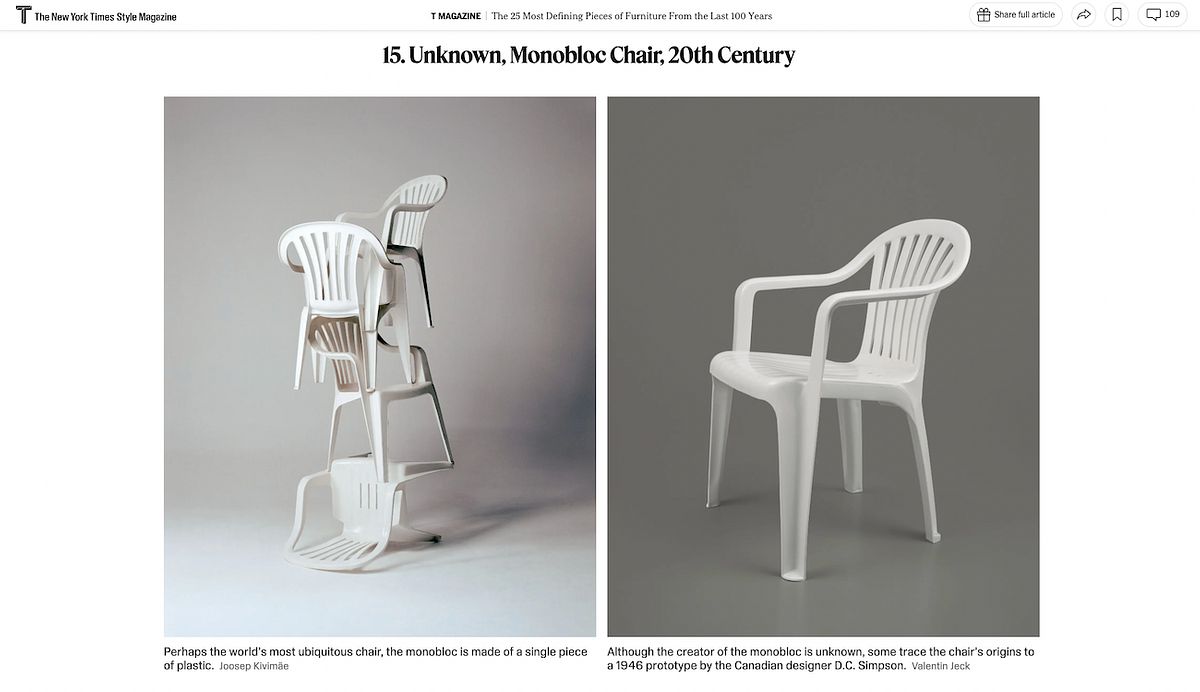 Vào năm 2024, tờ The New York Times công bố danh sách 25 thiết kế nội thất tiêu biểu của thế kỷ qua, do hội đồng gồm các nhà thiết kế, nghệ sĩ và giám tuyển từ những bảo tàng danh tiếng bình chọn. Bất ngờ thay, ghế monobloc, chiếc ghế nhựa phổ thông quen thuộc với người dân Việt Nam và nhiều quốc gia khác, cũng góp mặt trong danh sách này.