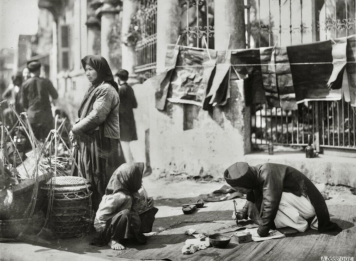 Ông đồ viết chữ trên phố Hà Nội, 1913-1917. Ảnh: Léon Busy.
