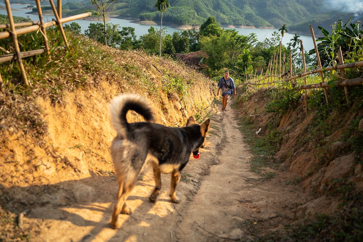 Con đường đất dẫn xuống hồ giữa những ngôi nhà bình dị.