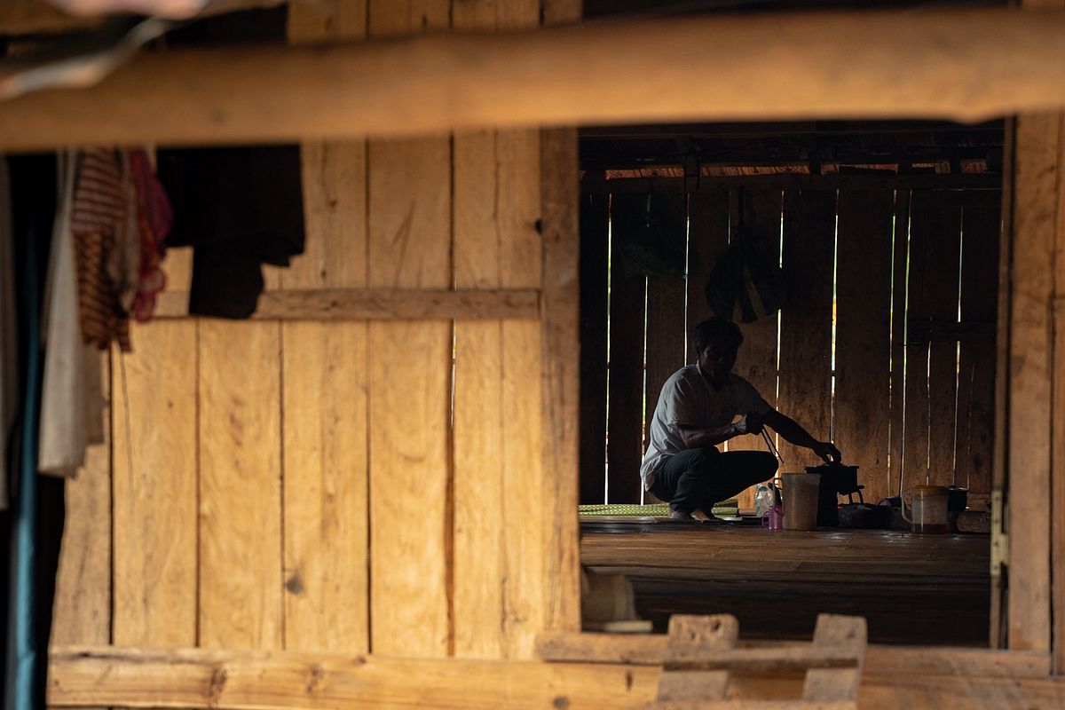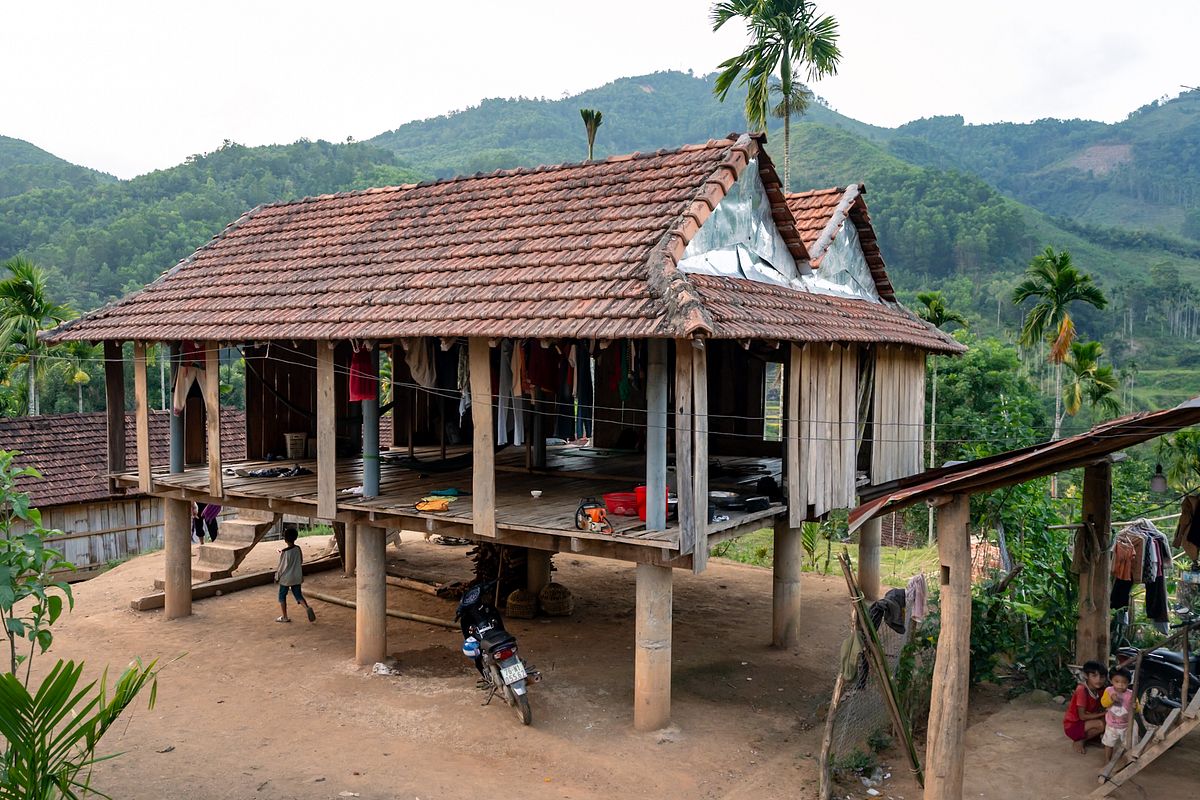 Nắng chiều vương lại trên hiên nhà sàn khi ngày dần khép lại.