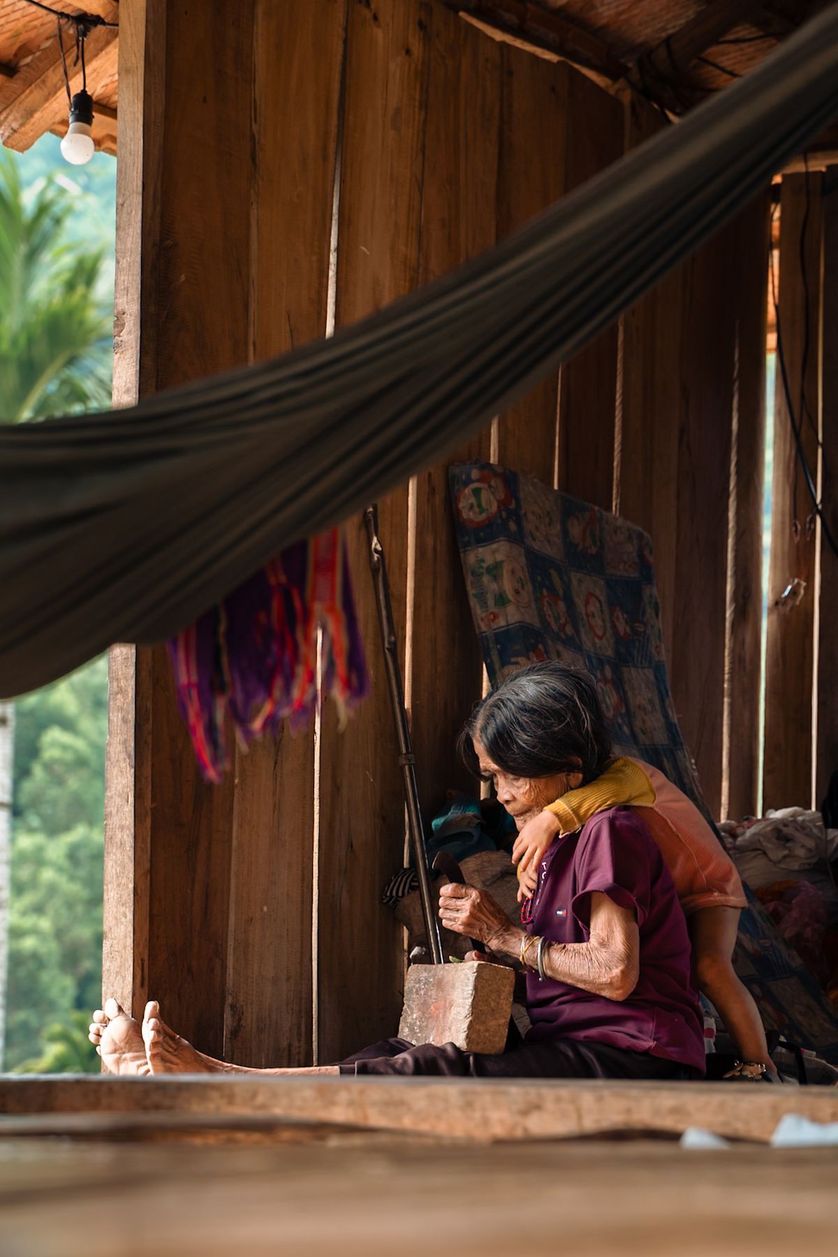 Đứa cháu nhỏ tựa đầu vào vai bà.