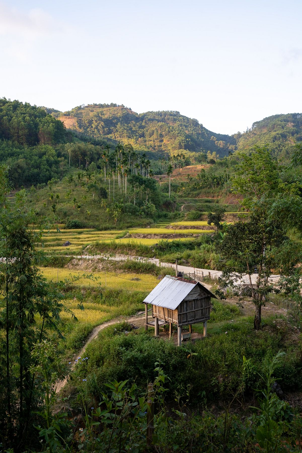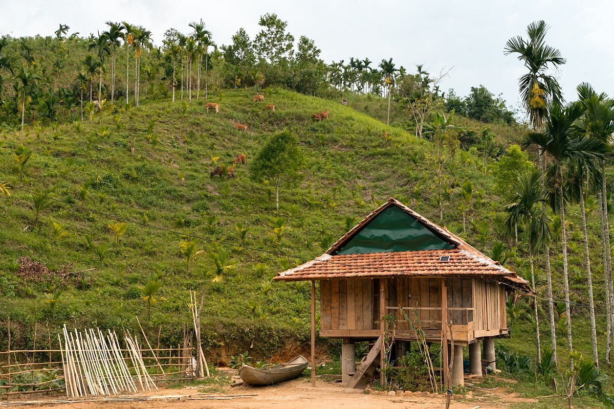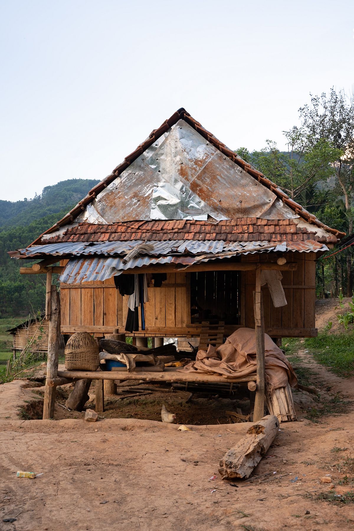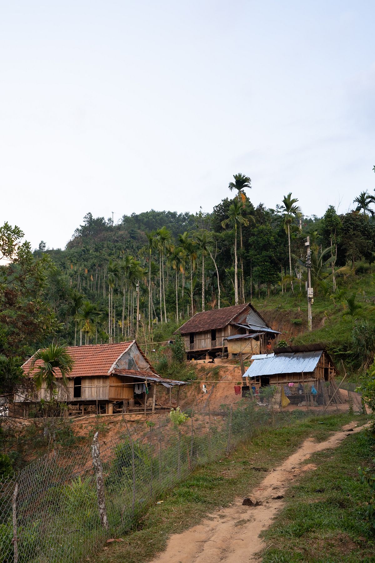 Nhà cửa rải rác bên sườn đồi, nối với nhau bằng những lối mòn.