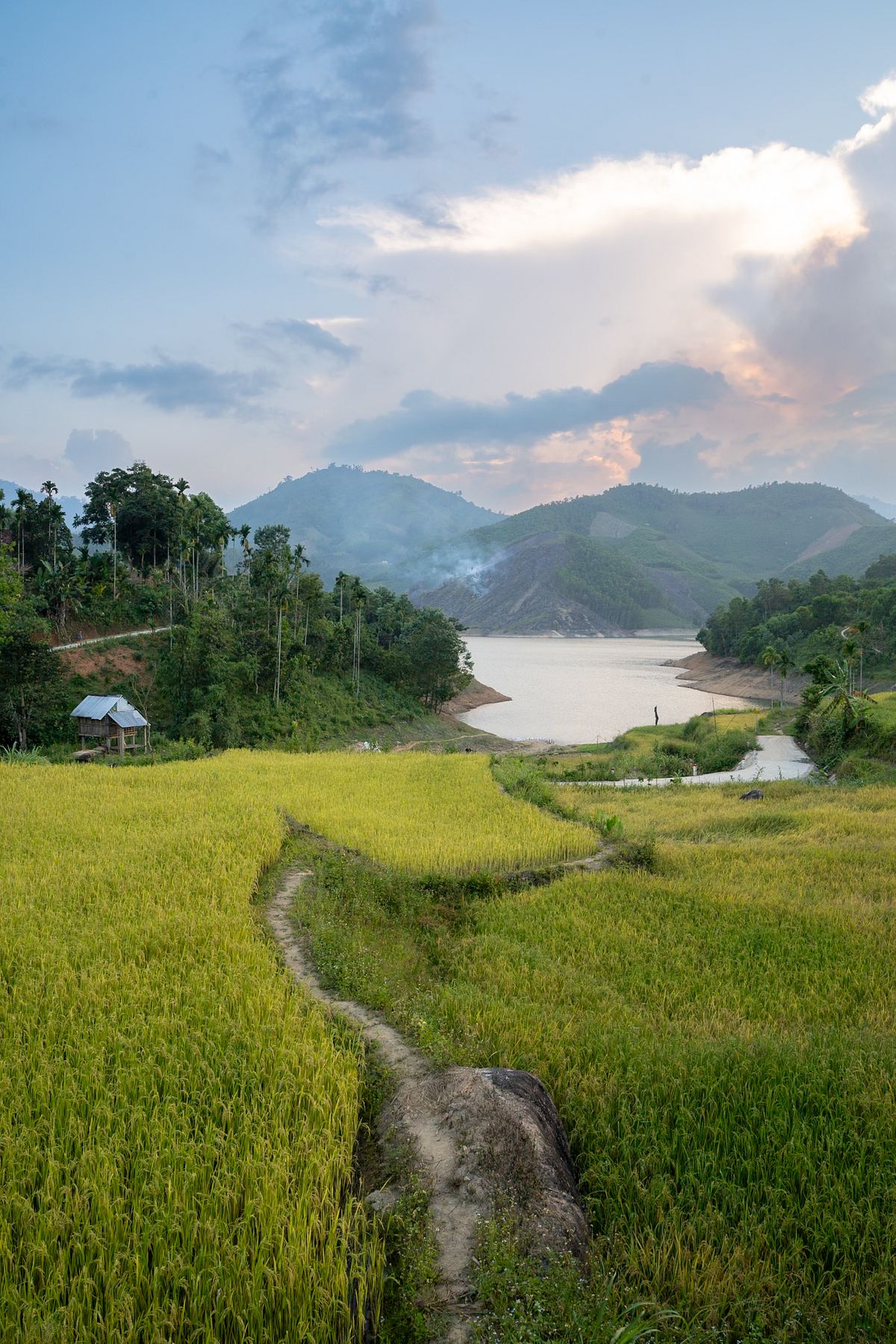 Những thửa ruộng bậc thang thoai thoải dẫn lối về phía lòng hồ nhân tạo.