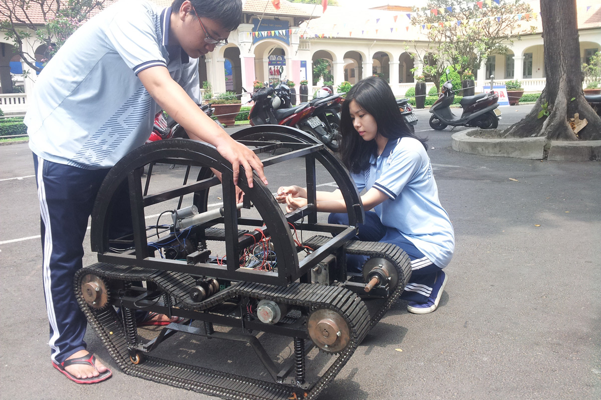 Two Saigon high school students made a big impression at an international science-engineering fair in the US for their all-terrain wheelchair design.