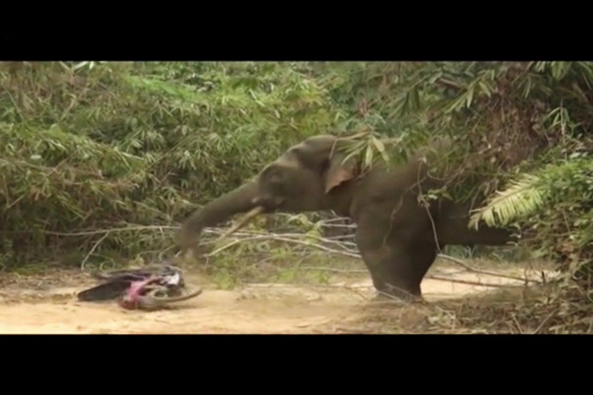 Wild Elephant Wanders out of Forest, Searches for Food, Crushes Motorbike