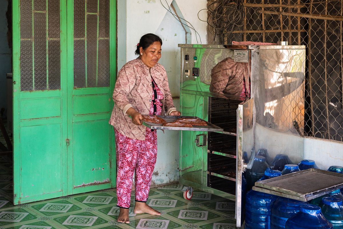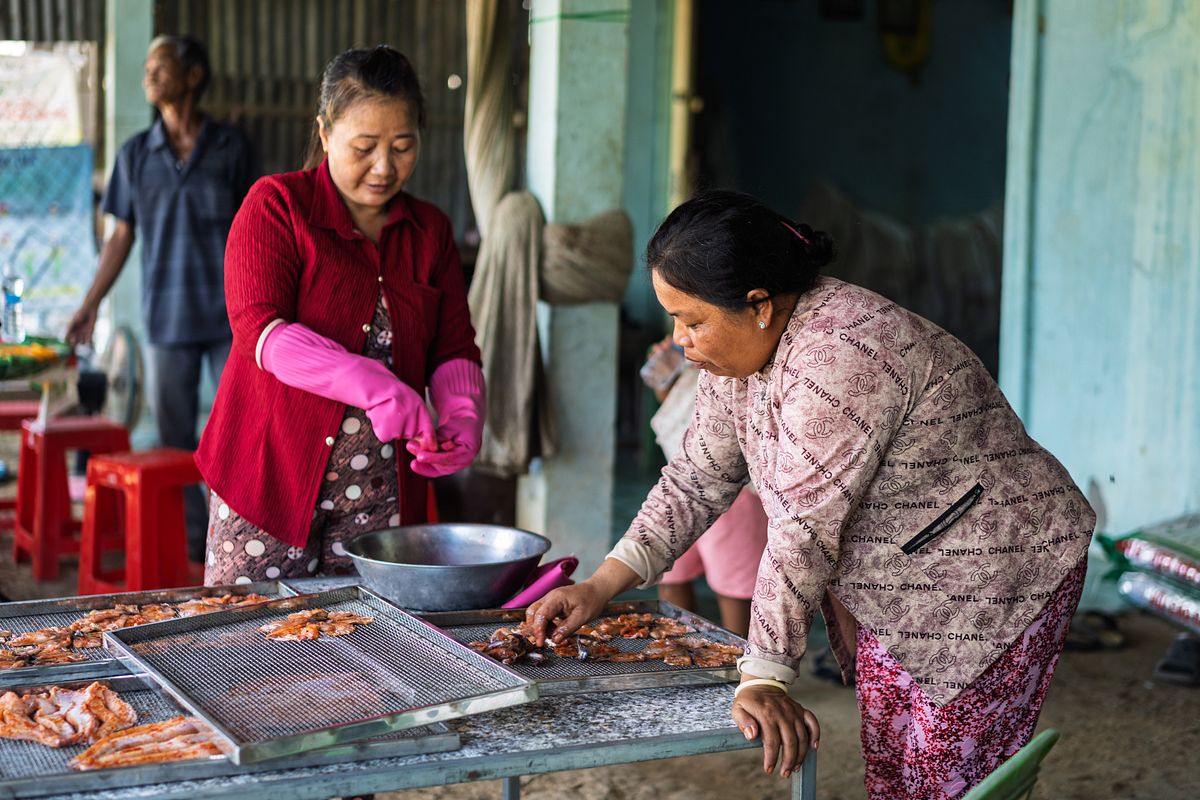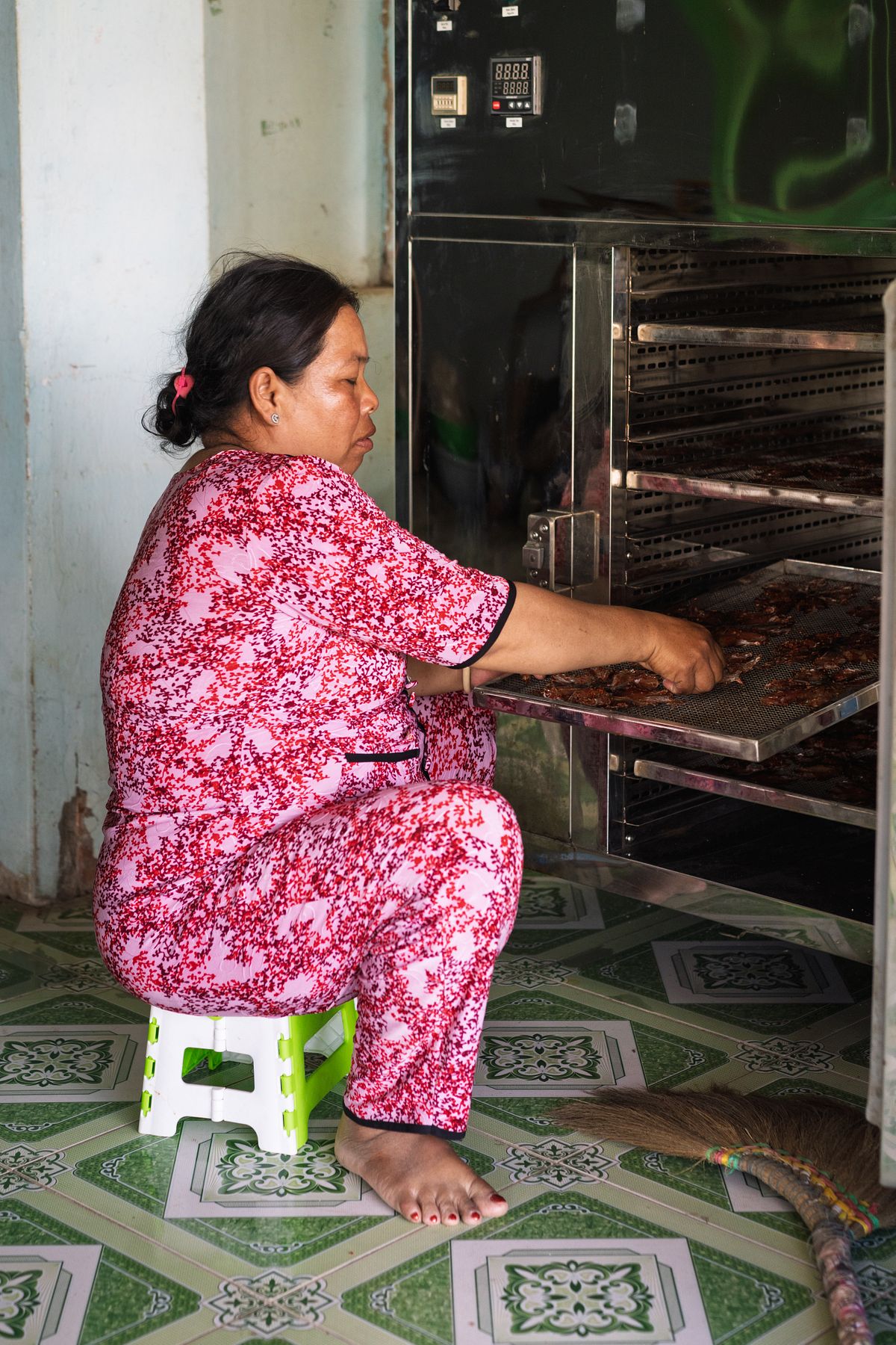 The Mekong Delta is developing faster than Google Maps can keep up with. A stretch of road that was too narrow to accommodate cars and required a transition to motorbikes just six months ago was under construction during our August visit. Gargantuan machines for laying pulverized gravel inched aside to let our 7-seater pass so we could reach the home of Nguyễn Thị Thu Thủy to check in on her small fish drying home business.
