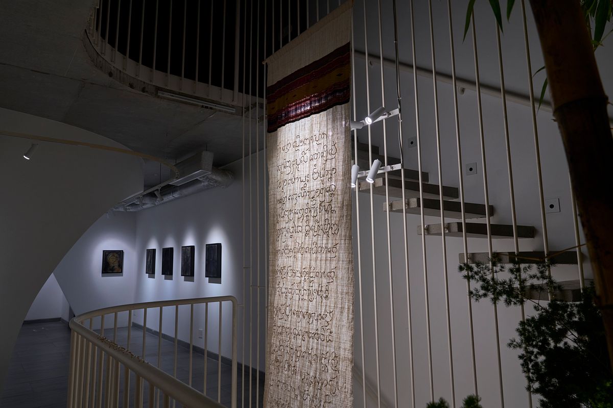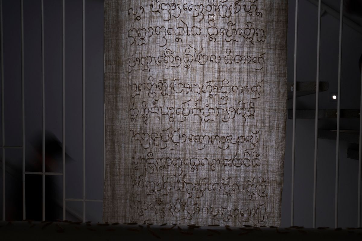 Spanning across three different levels in between the staircases, Willie Xaiwouth’s The Fading Breath of Forgotten Words presents script embroidered onto fabric, using bamboo flowers collected from his hometown Saiyabouli (Laos). Viewed from above, the Tai Tham script flows downwards along the fabric and slowly fades away. Belonging to the Tai Yuan people, descendants of the Lan Na Kingdom between the 13th and 18th centuries, now scattered across Laos and Thailand, Willie weaves together his own story and a fragile cultural legacy amidst changes of history and modern times.