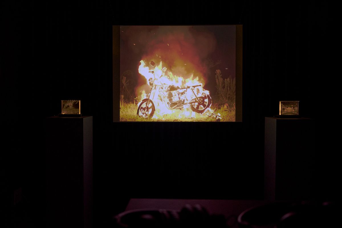 In a reimagined alternative world, Hà Đào portrayed the notorious Hải Phòng female gangster Dung Hà as a transgender man wandering through the street like a ghostly figure in If Heaven Awaits. The work takes the form of a music video with 1990s Vietnamese aesthetics with Lam Trường’s ballad “Đêm Nay Anh Mơ Về Em”. Accompanied with the video work also features two laser-engraved crystal cubes, Castle I (Vũ Hoàng Dung’s Tomb) & Castle II (Đồ Sơn Casino), an empire that faded and now exists only in memory and imagination. Focusing on marginal lives, her works also resist and question mainstream narratives, stereotypes and social norms.