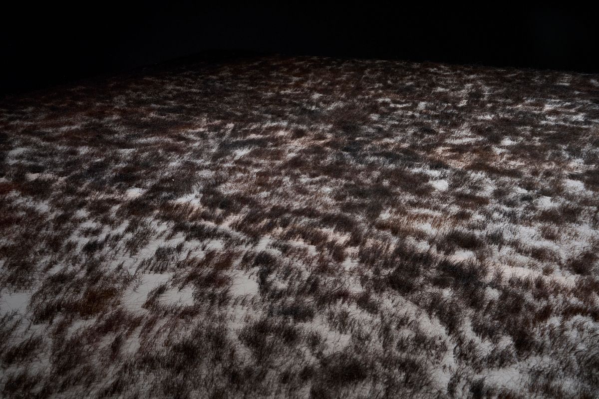 Unforgotten Land glows softly in a darkened space. Composed of hair stitched and pressed onto fabric by Hằng Hằng and her family, the work was created from a collective effort and speaks for family’s history and internal dynamics. The hair, gathered from her mother’s salon and the surrounding community, forms a surface resembling a fragile, scorched grassland. Each strand carries memories of war, conflicts, migration, yet also love and care. Through the material intimacy of hair, the work also reflects on what it means to collect, inherit, and carry historical legacies onward.