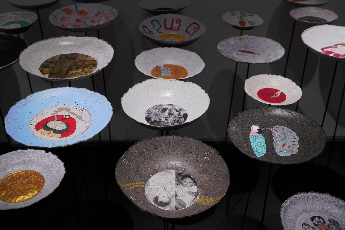 Hul Kanha’s installation Plates of the Passed comprises fifty papier-mâché sculptures floating on thin poles across the space. Rendered with vibrant colours and childlike brushstrokes, the plates combine painted imagery, black-and-white photographs of childhood and family memories, sewn red threads, and gold paint. The brushstrokes and threads appear to hold cracks and lines together, while also evoking childhood trauma shaped by extreme hardship in rural Siem Reap. On these fragile surfaces, childhood memories are reworked through the artist’s adult perspective and personal recollection.