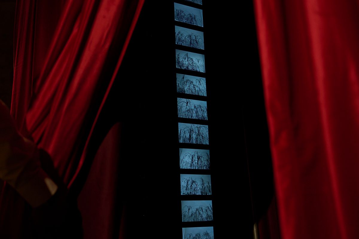 On the highest floor, Lê Tuấn Ry’s 18 Realms of Mound is placed behind a red curtain. Here, the visitors assume the role of spectators, activating a music box and observing a vertical row of CCTV screens that display a site-specific installation composed of old X-ray films of anonymous bodies – collected from clinics and hospitals and threaded together – located in an unknown, remote place. His work poses questions of surveillance and perception: "who is watching, who is being watched, and what becomes of that which slips outside the frame?"