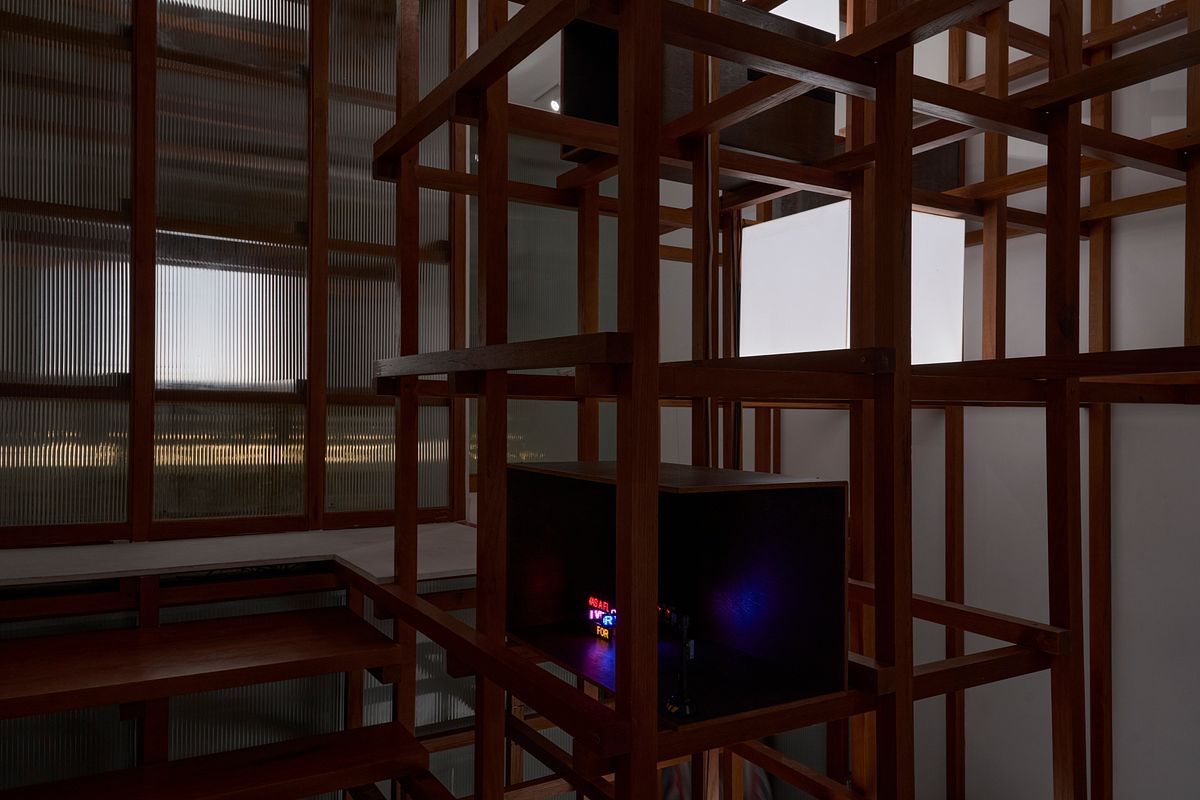 Thuỷ Tiên Nguyễn’s series on miniature sculptures of everyday forms – Untitled (Notes on romance and cities), incorporates a system of feedback and sonic circuity, where street sounds, and melancholic music play on loop, as the objects remain hidden within wooden boxes along Dogma’s signature architectural structure. The installation evokes the feeling of mini theaters, with shifting backdrops behind a miniature couple, armchairs on a spinning stage, or flashing LED lights. The miniature works form a world on their own where time is trapped in repetition, with an emerging quiet sense of nostalgia and loneliness.