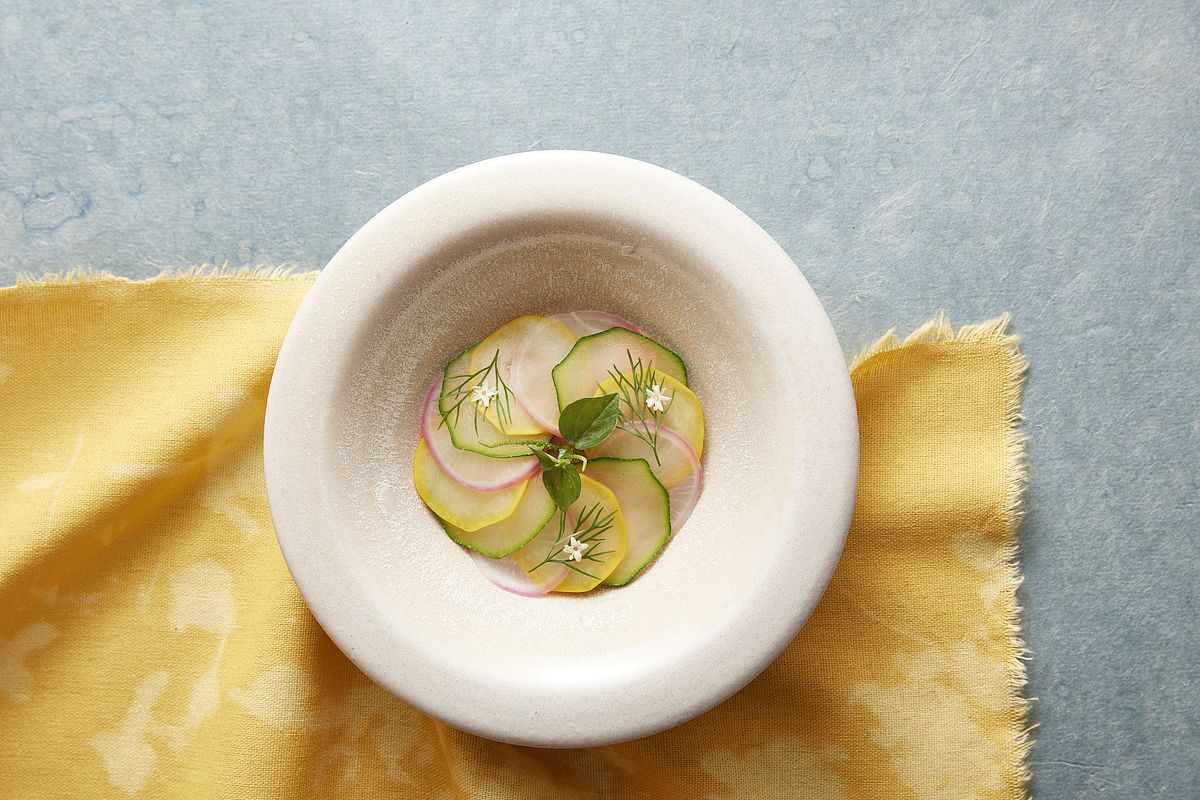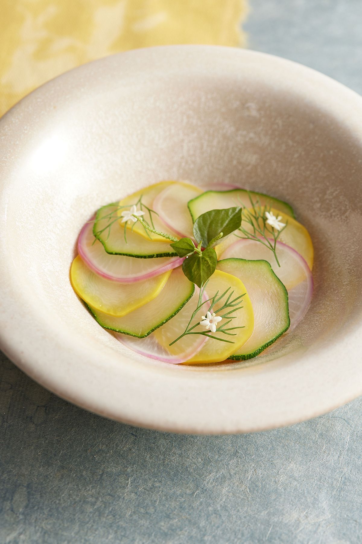 Paper-thin slices of zucchini and radish bring a crisp, refreshing contrast, while toasted pumpkin seeds add a layer of nutty richness. The result is a dish that feels both grounded and elevated, a microcosm of the coast where acidity, crunch, and umami exist in harmony.