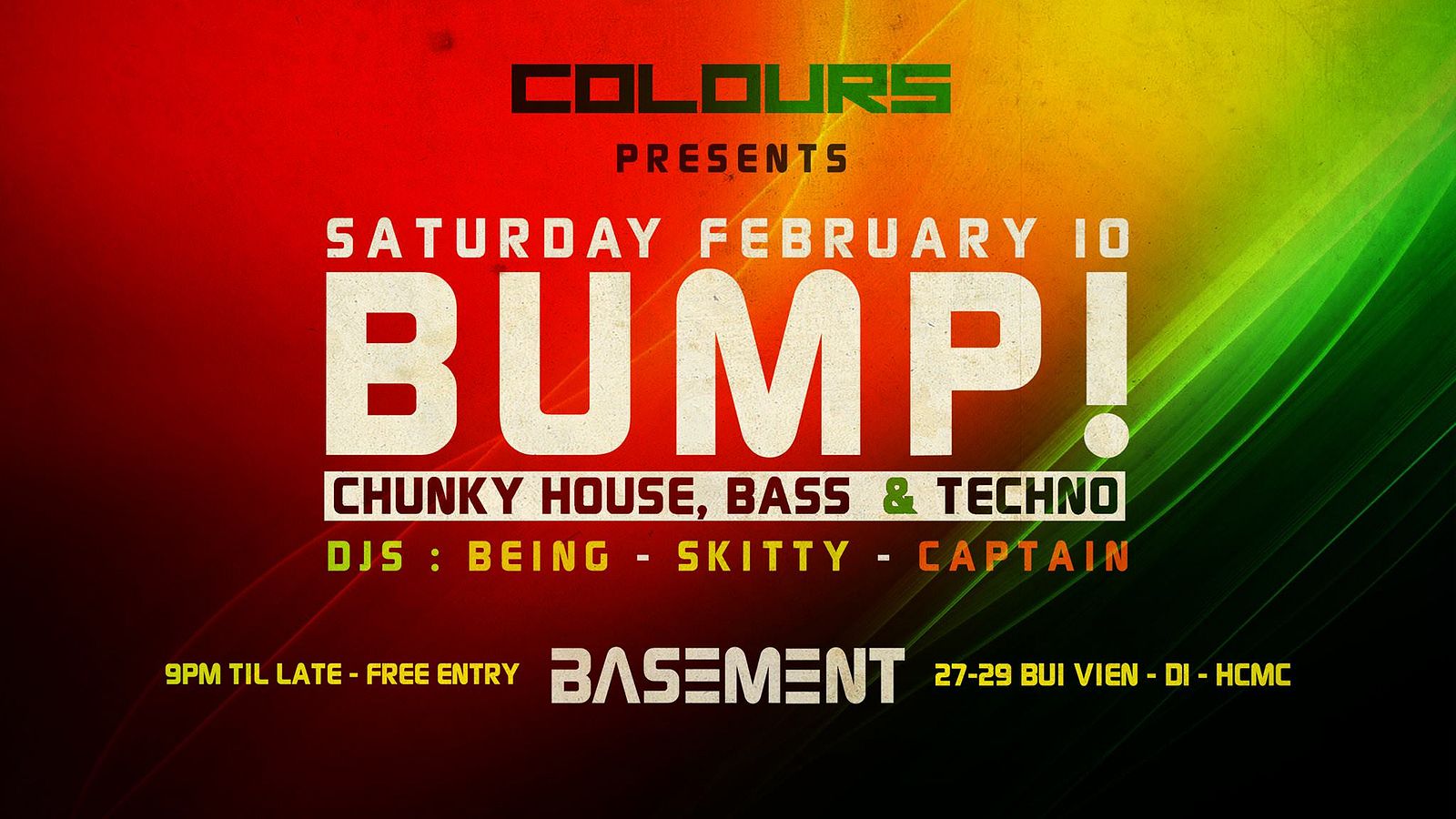 From the organizer: On Saturday 10th of February the Colours Saigon team will be bringing you another night of bass heavy, dancefloor focused house, bass, and techno music.With DJs Being, Skitty and Captain on the decks all night!Free Entry - 10pm to 4amhttps://www.facebook.com/events/579727032361238/ Saturday, 10 February10:00pm - 4:00amBasement | 27 - 29 Bui Vien, D1, Ho Chi Minh CityJavaScript must be enabled in order for you to use Google Maps.However, it seems JavaScript is either disabled or not supported by your browser. To view Google Maps, enable JavaScript by changing your browser options, and then try again.