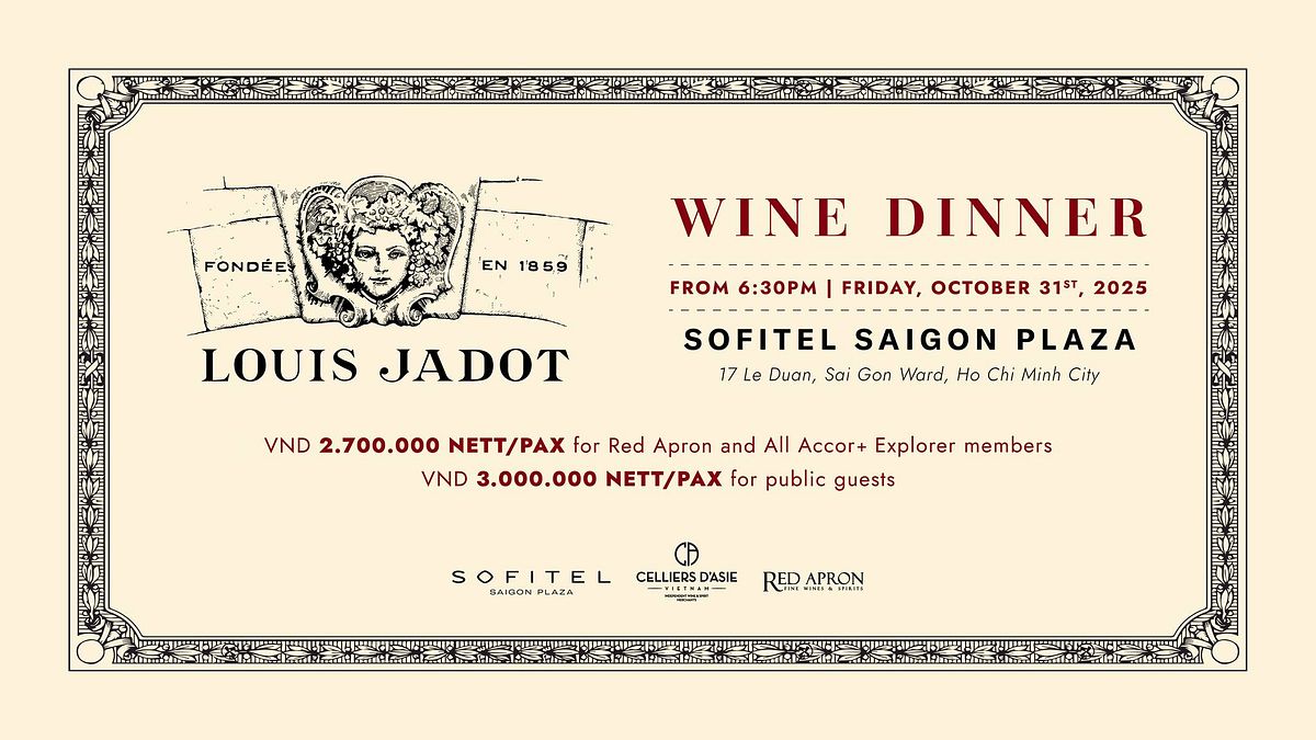 Experience a refined French culinary journey with Sofitel Saigon Plaza, accompanied by wines from Louis Jadot, one of the most prestigious wineries in Burgundy. Don’t miss the chance to savor the finest wines with Louis Jadot’s Asia Pacific Regional Manager, Elie Peres, and enjoy a special 7-course menu at Le 17 Bistro on the upcoming October 31st!