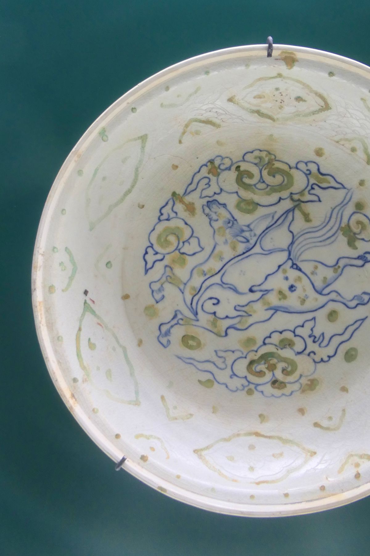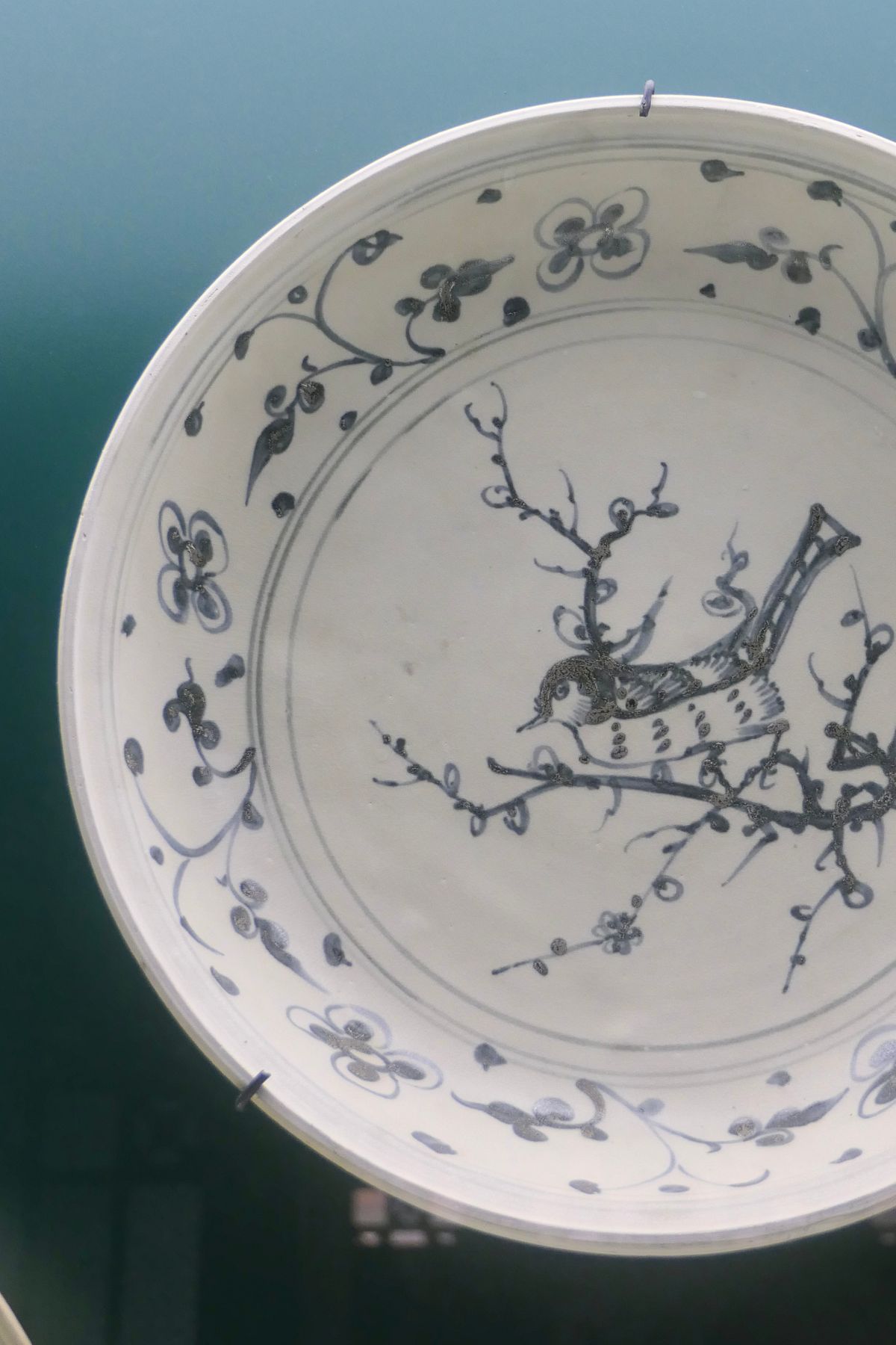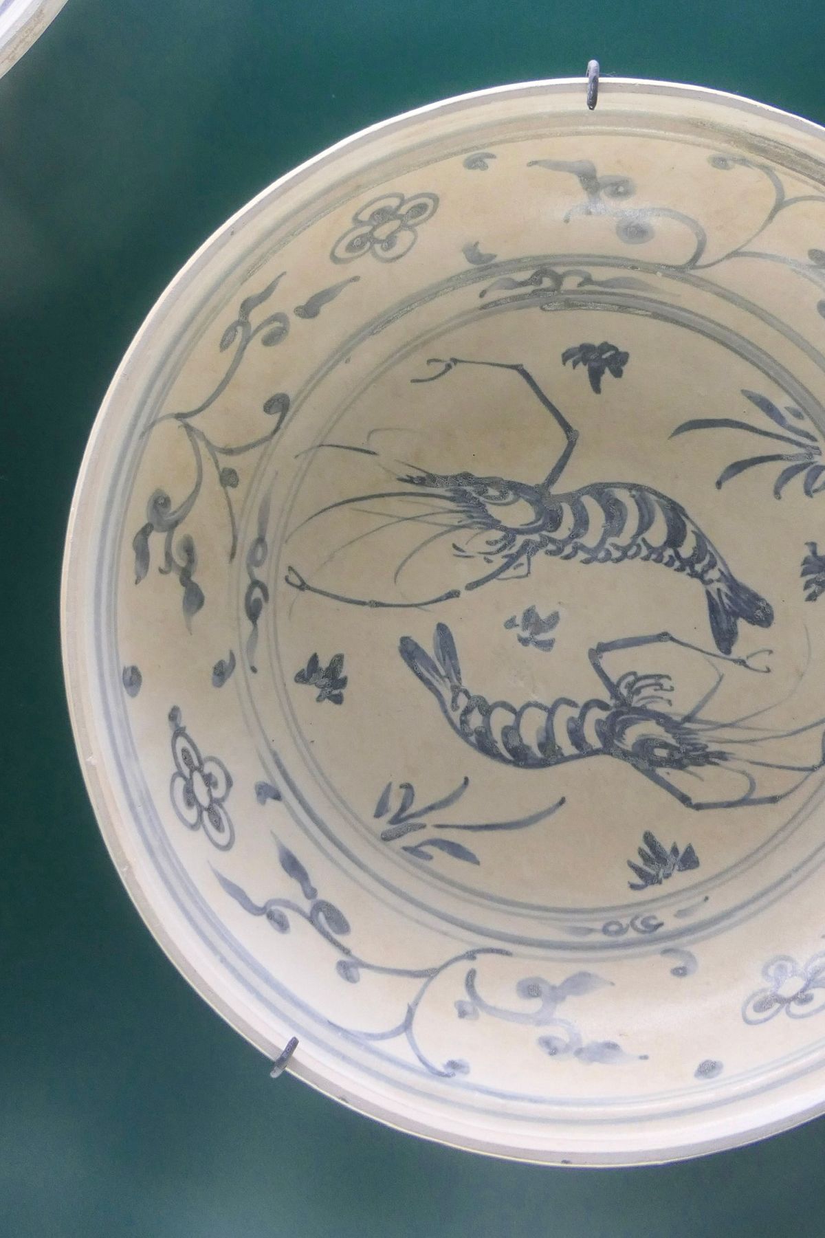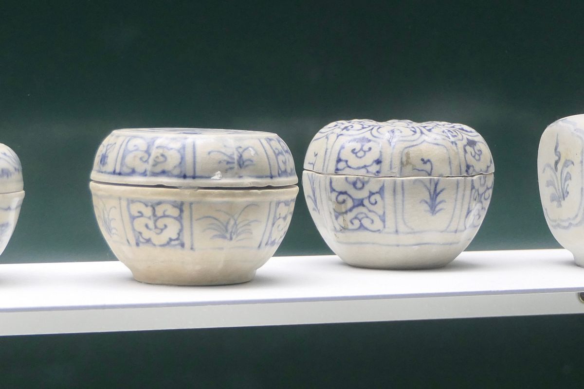 Beginning with artifacts from Vietnam itself, a collection of high-quality Chu Đậu ceramics was found from the 15th-century Chàm island shipwreck in Quảng Nam. It includes an estimated total of 240,000 artifacts, including ceramics of foreign origins, excavated over three years from 1997 to 2000. Chàm Island (Cù Lao Chàm), which belongs to Hội An, occupied a significant position along the Southeast Asian trade routes. Originally produced in Hải Dương, Chu Đậu ceramics flourished in the 15th century and are renowned for their fine lines and decorative motifs of flora, animals, landscapes, and folk-inspired themes. The pieces found in the Chàm island shipwreck were primarily blue-and-white wares: housewares, containers, utensils for eating and drinking, and items used for religious ceremonies. Designed specifically for the overseas market, the ceramic pieces highlight both the kingdom’s development of export ceramics and participation in international trade.