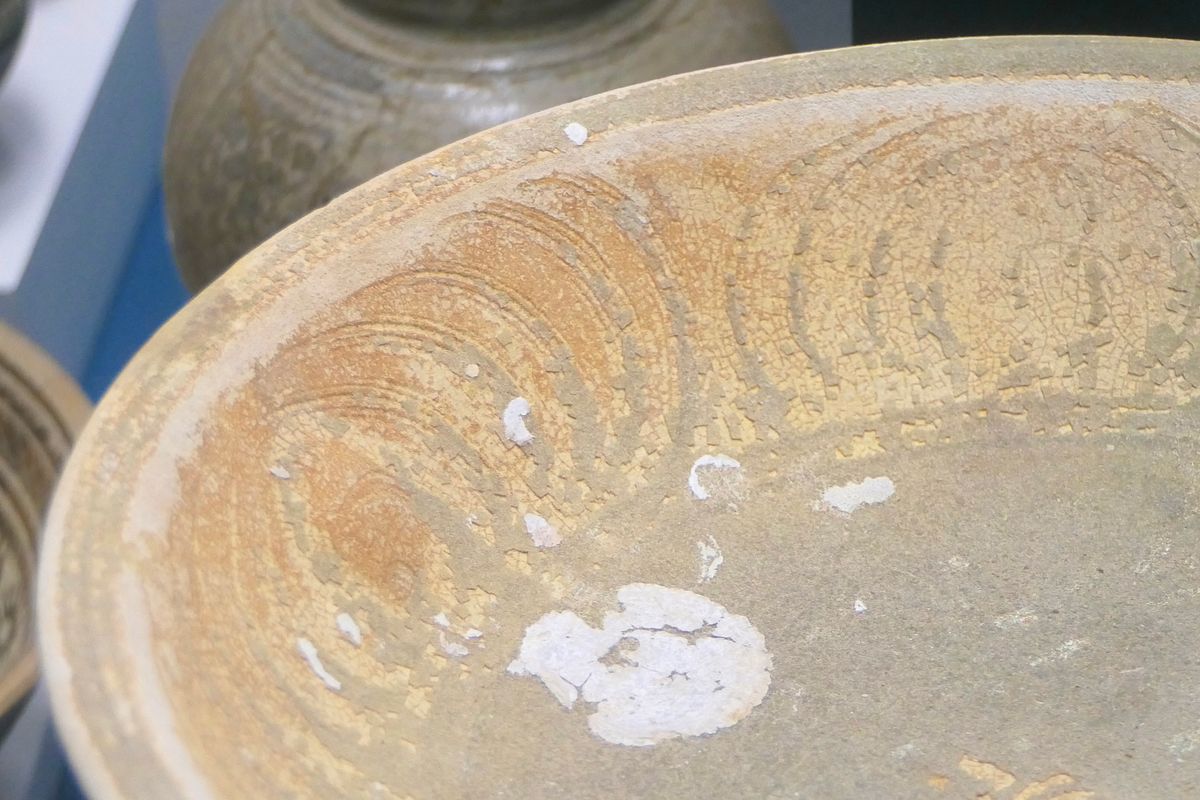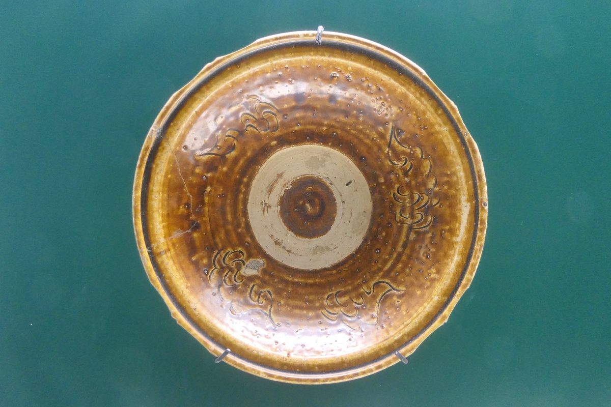 An important collection from the shipwreck features “Chăm pottery,” as described by the museum text: glazed ceramic crafted by the Chăm people or using Chăm techniques within the Champa kingdom (present-day Central Vietnam), dating from 2nd to 17th centuries. These objects seem to have been overlooked in Chăm history, compared to the more prominent religious statues in museum collections. The artifacts on display include brown-glazed, green-glazed stoneware dishes, bowls, and ewers. Highlights on display is a large dish decorated with Chăm script along its edges, alongside large jars with floral motifs.