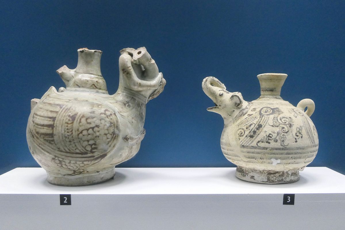 Kinnari-shaped ewer (left) and Elephant-shaped ewer (right). Iron-brown and white-glazed stoneware. Thailand, 15th century.