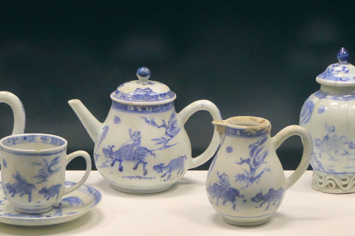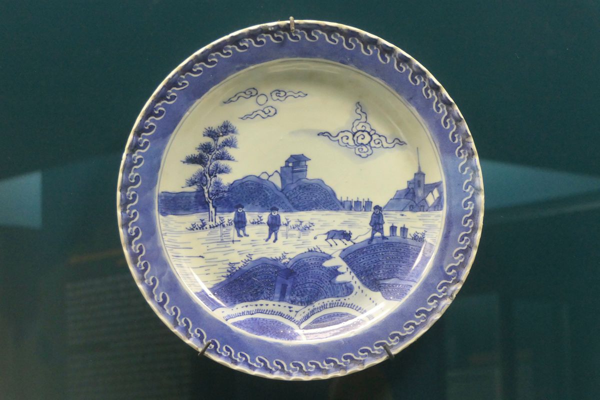 In addition, many pieces feature European motifs. A notable example is a plate decorated along the edge with sea wave patterns, with images of two men and another man walking with a buffalo. According to Nguyễn Đình Chiến’s article “Đồ gốm sứ trong các con tàu đắm ở vùng biển Việt Nam” (Ceramics from the shipwrecks off the coast of Vietnam), the plate depicts a landscape of a fisherman village in Deshima — an artificial island served as a Dutch trading post in Nagasaki, Japan in the early mid mid-17th century — showing a sand hill, with a lighthouse, a church, and houses by the fishing boats appearing behind. This indicates that similar wares, including milk bottles and wine jugs, were made to fill the demand from the European market at the time.