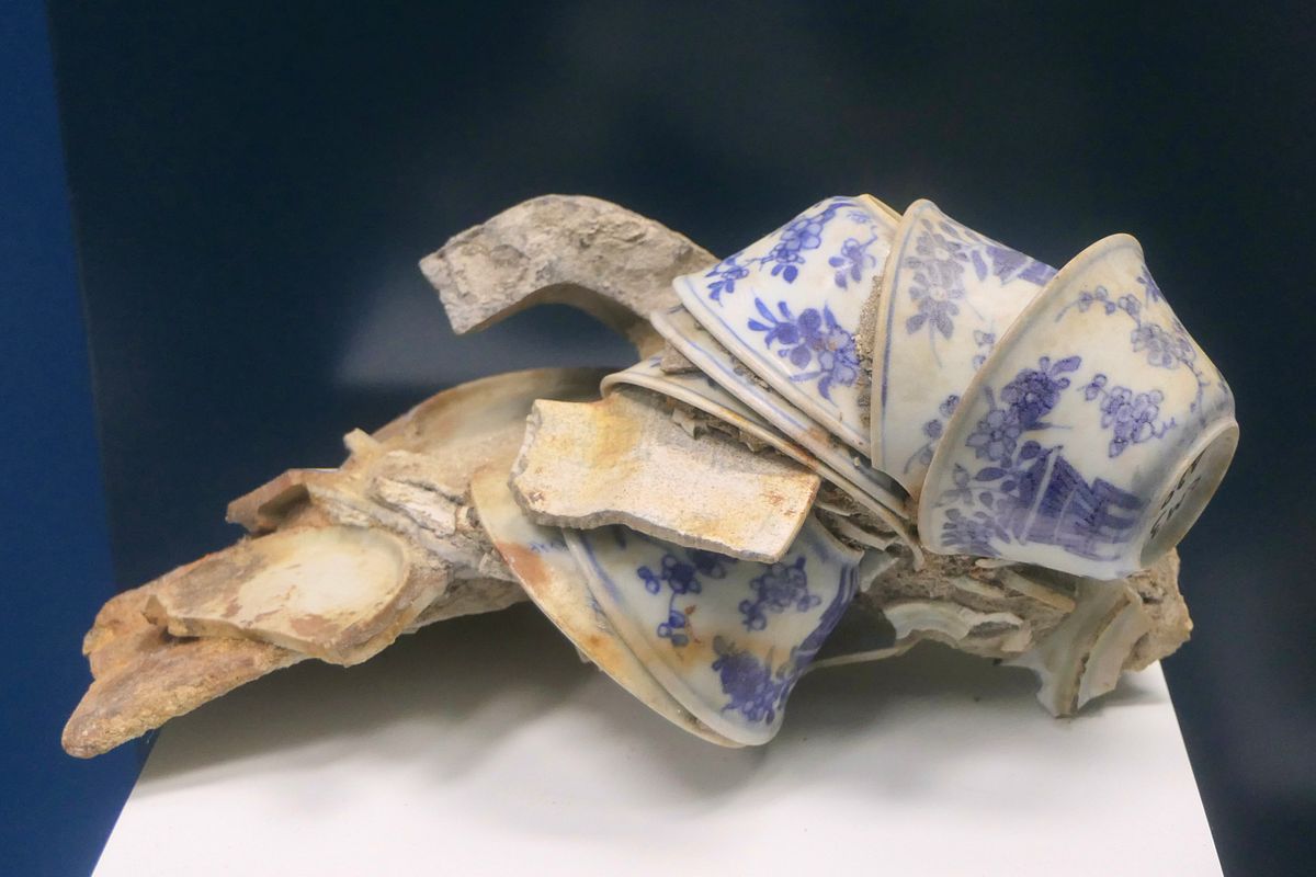One standout piece from this shipwreck is an artifact composed of stacked Chinese blue-and-white tea cups, referred to by the museum as the 18th-century “Sea sculpture.” Despite its small size, it embodies both fragility and endurance, surviving against the underwater pressure and through layers of time. Its mass of wrecked and broken remains fused together. The positioning of the cups suggests how such wares may have been packed within containers during their journey across the sea. Although the ship’s routes and destinations remain unknown, the shipwreck’s location in Cà Mau waters suggests that it may have been heading south from China towards the Malay Archipelago, before continuing across the oceans to other continents.