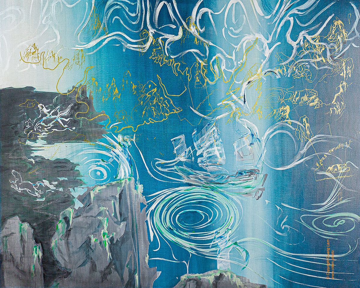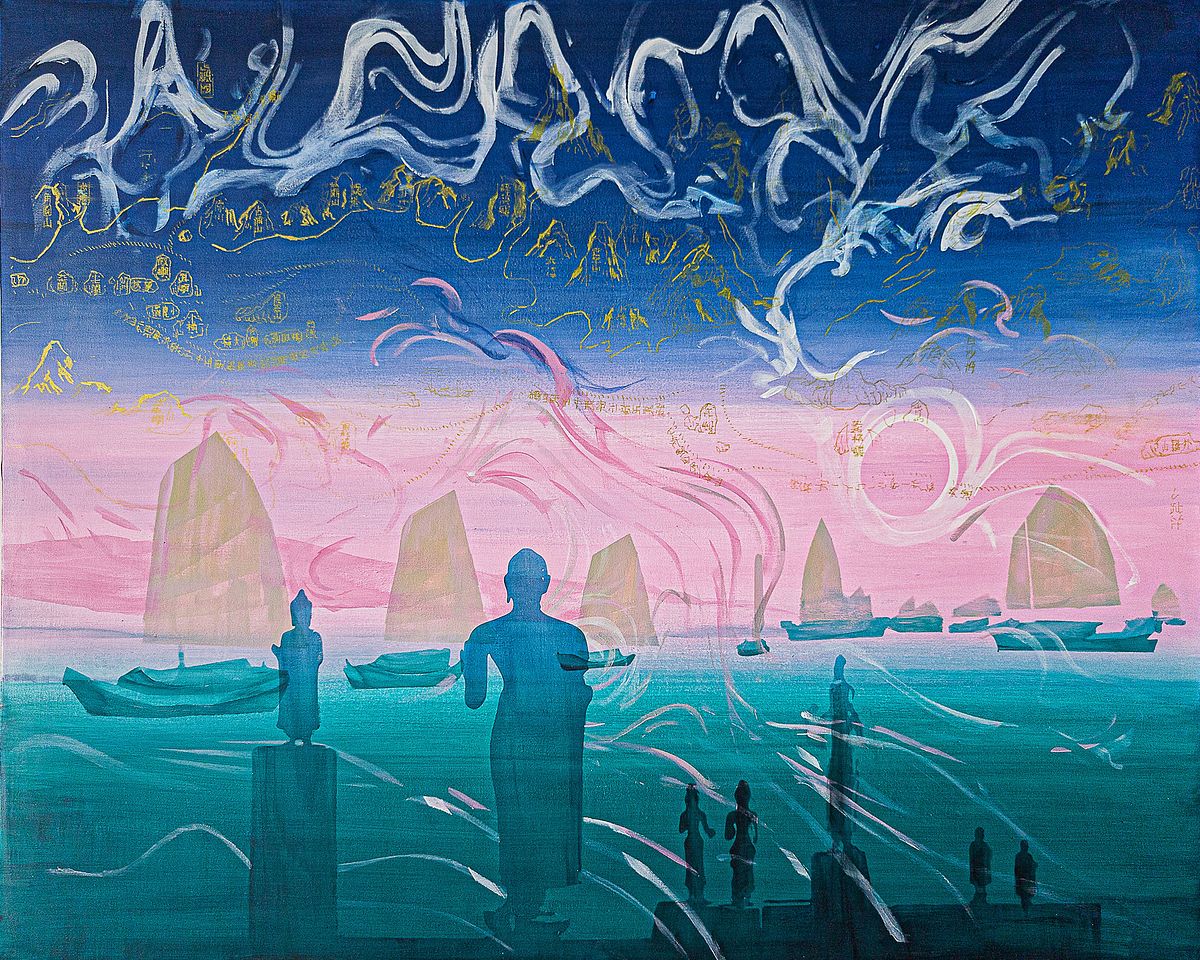 In other paintings, such as ‘Dancing with the storm’ (2025) and ‘Oc Eo Aurora’ (2025), the imagery shifts towards sea and mountainous terrains, depictions of the wind currents, and shipwreck scenes. One work depicts ships coming from afar, with silhouettes of ancient Oc Eo statues appearing across the horizon. The main reference behind these paintings is the historic Mao Kun map, also known as Zheng He’s Navigation Map, published in 1628 during China’s Ming dynasty. Originally created as a rollable strip map documenting coastal regions and islands along the maritime routes, it is considered to be the earliest known Chinese map on the maritime Silk Road connecting different parts of Asia, Persia, Arabia and East Africa. By adopting this Asian map as a reference, Quang intentionally moves away from the Eurocentric perspectives that have long dominated historical mapping and education.
