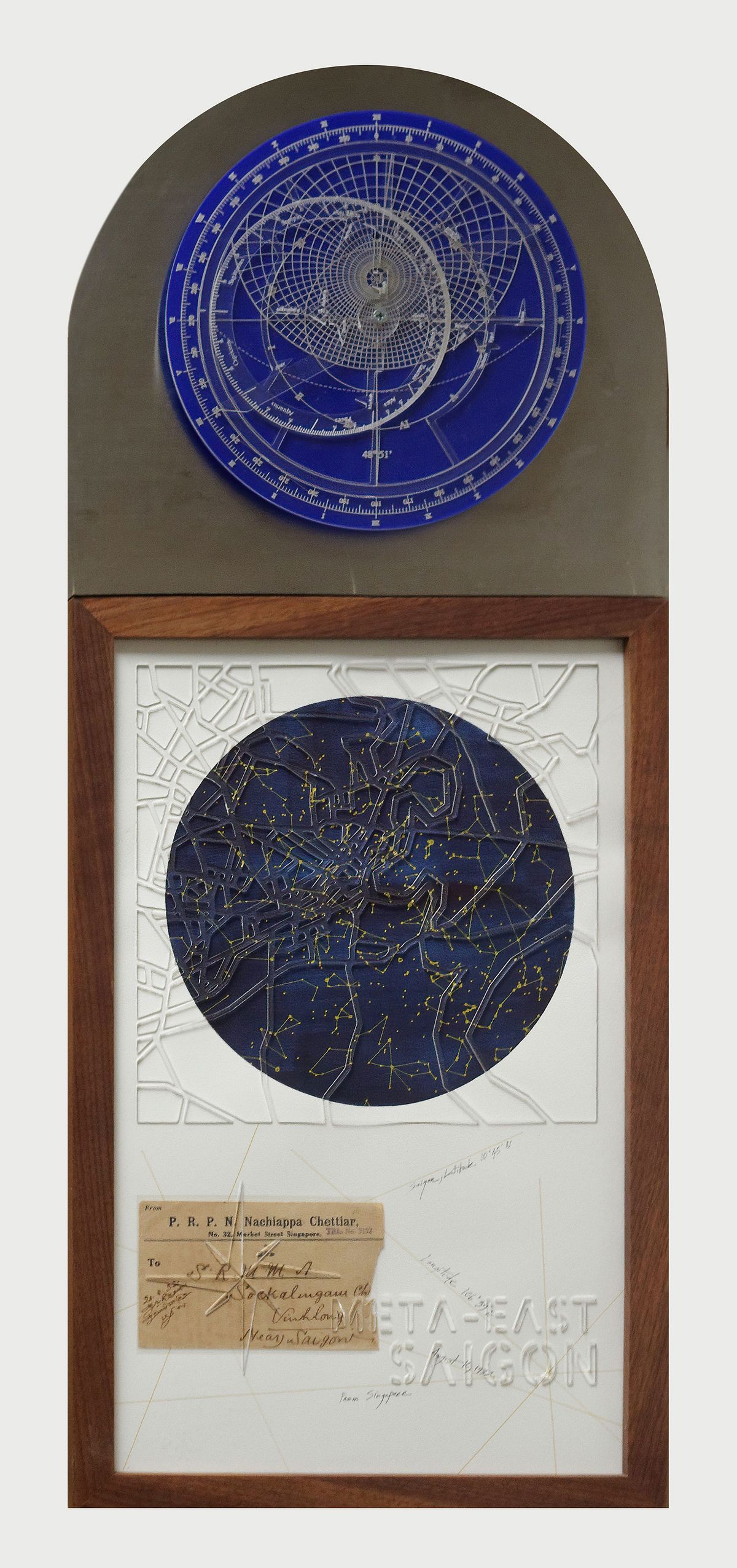 ‘Astrolabs Hanoi–Saigon,’ 2024. 90 x 36cm. Inox, plexiglass, wood, paper, postcard. Photo courtesy of the artist.