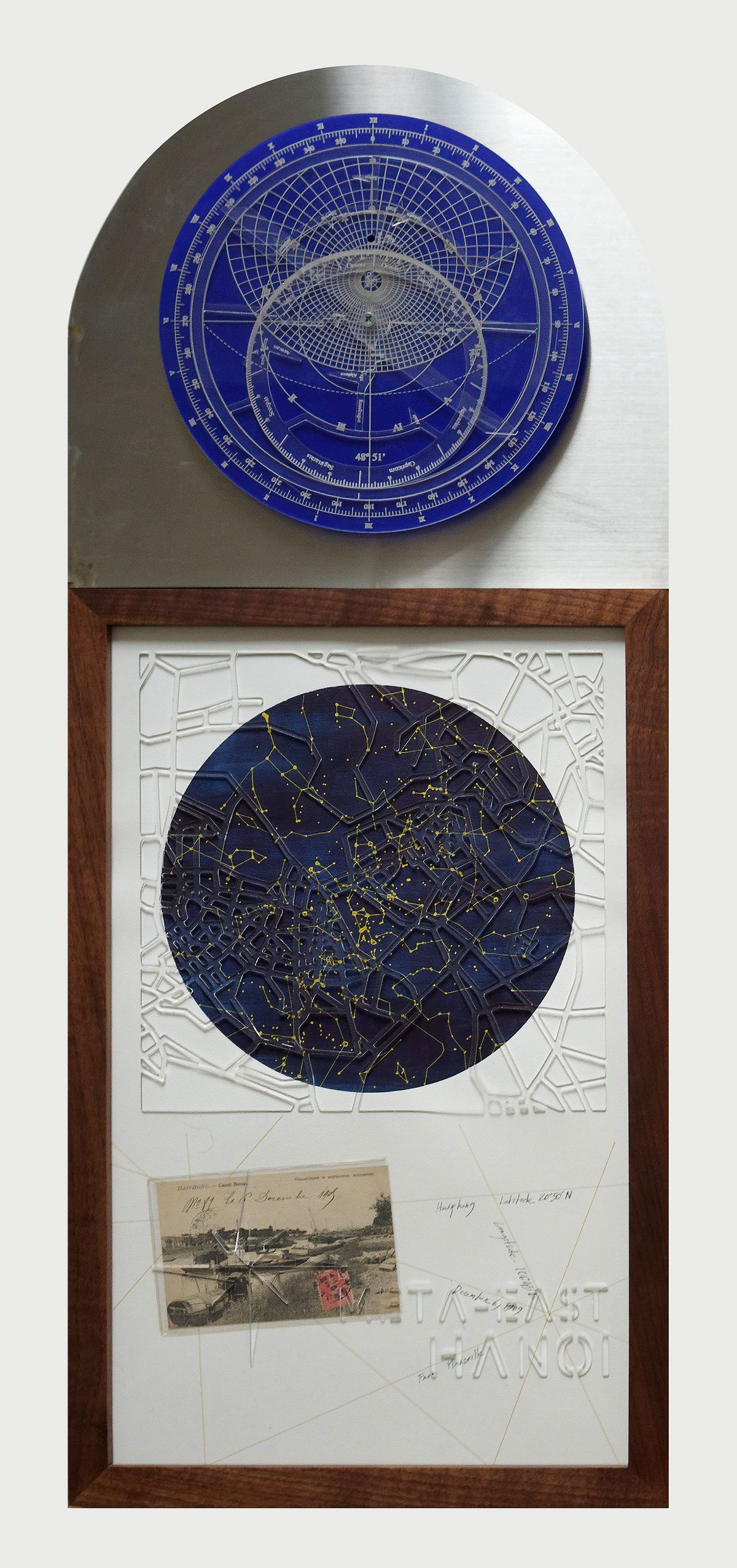 ‘Astrolabs Saigon–Hanoi’ (2024) features an astrolabe-like structure, composed of large ruler forms positioned at the top, paired with die-cut plexiglass panels engraved with city maps. Beneath the plexiglass layer is a painted star chart, alongside archived letters with destinations written on the envelopes. According to the artist, the constellations depicted in the work are calculated according to the specific date on the letters, determining the positions of the stars at that moment. The letters contain names of senders and recipients from different locations, with postal stamps and sending and receiving dates, providing the basic geographic information of who, where and when. Collected by the artist, the letters themselves are artifacts representing lived histories of movement, measurement, and communication.