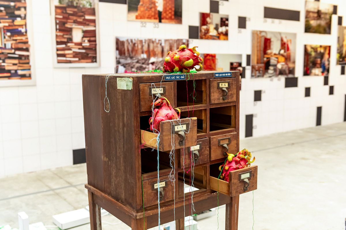 The work took inspiration from the Vietnamese origin myth “Con rồng cháu tiên,” which depicts the Vietnamese people as descendants born from 100 eggs laid by the dragon lord Lạc Long Quân and the fairy Âu Cơ; following their separation, 50 eggs were taken to the mountains while 50 returned to the ocean. In this installation, according to the exhibition text, the work “takes the fruits of the dragons [dragon fruits] as the symbol of the eggs, and along the various pictures combines with architectural and book elements to compose the timeline of contemporary Vietnam.” By linking this myth with the modern and contemporary Vietnamese history, which was marked by upheavals and violence, the work reflects on the shifting access to knowledge: from the colonial period, where it was largely restricted to a small number of intellectual elite, to the post-independence period when public libraries play an important role in making cultural resources and knowledge accessible to the public. The photography installation itself in this case represents an archive of knowledge and a timeline of cultural memory.