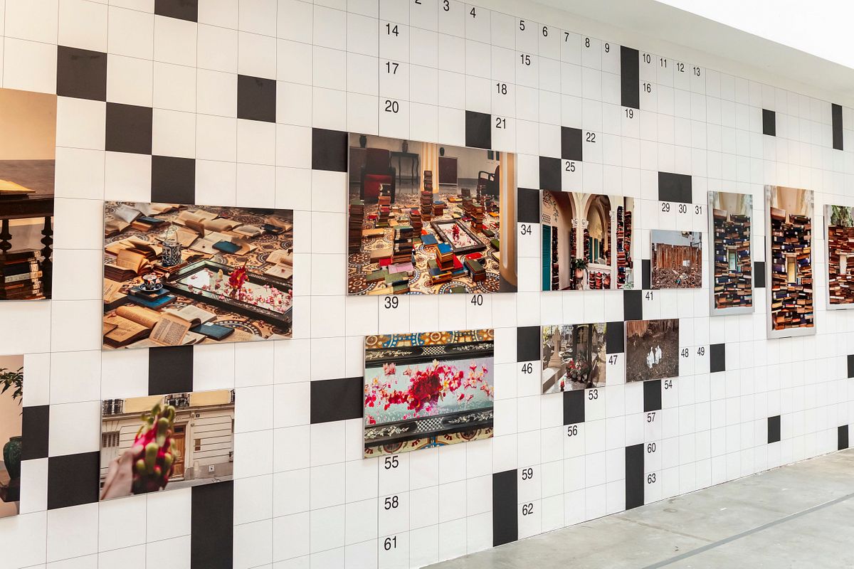 Returning to photography with an emphasis on archival materials accumulated throughout the years, Quang deLam’s “Tales from the Land of Dragons” (2025) was recently featured in the large-scale group exhibition “Archive and Post-archive” (2025) at Vincom Center for Contemporary Art (VCCA), curated by Đỗ Tường Linh and Éline Gourgues, as part of the Biennale Photo Hanoi 2025. The installation centers an index drawer surrounded by stacks of white boxes and books, with dragonfruits placed on top and inside the index drawer, and some in between the book stacks. These elements are connected by a dense network of electric wires and threads, with photography works of dragonfruits and books staged within old libraries on display in the background.
