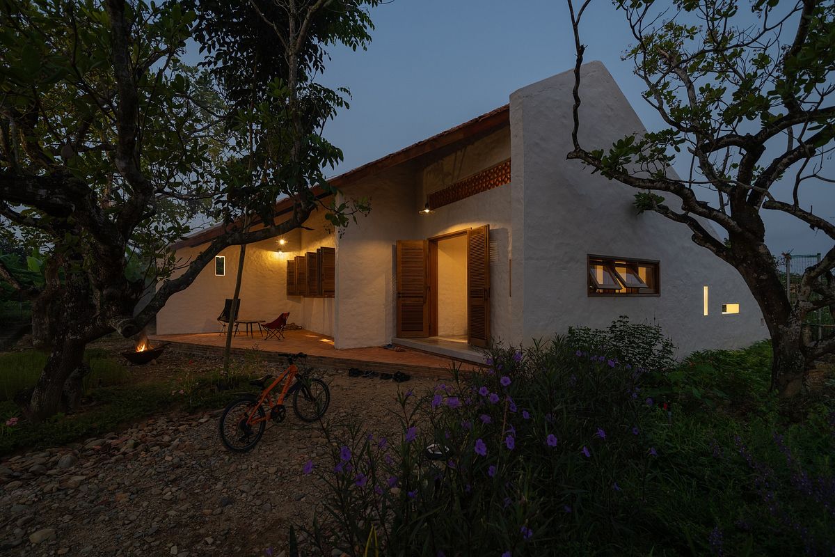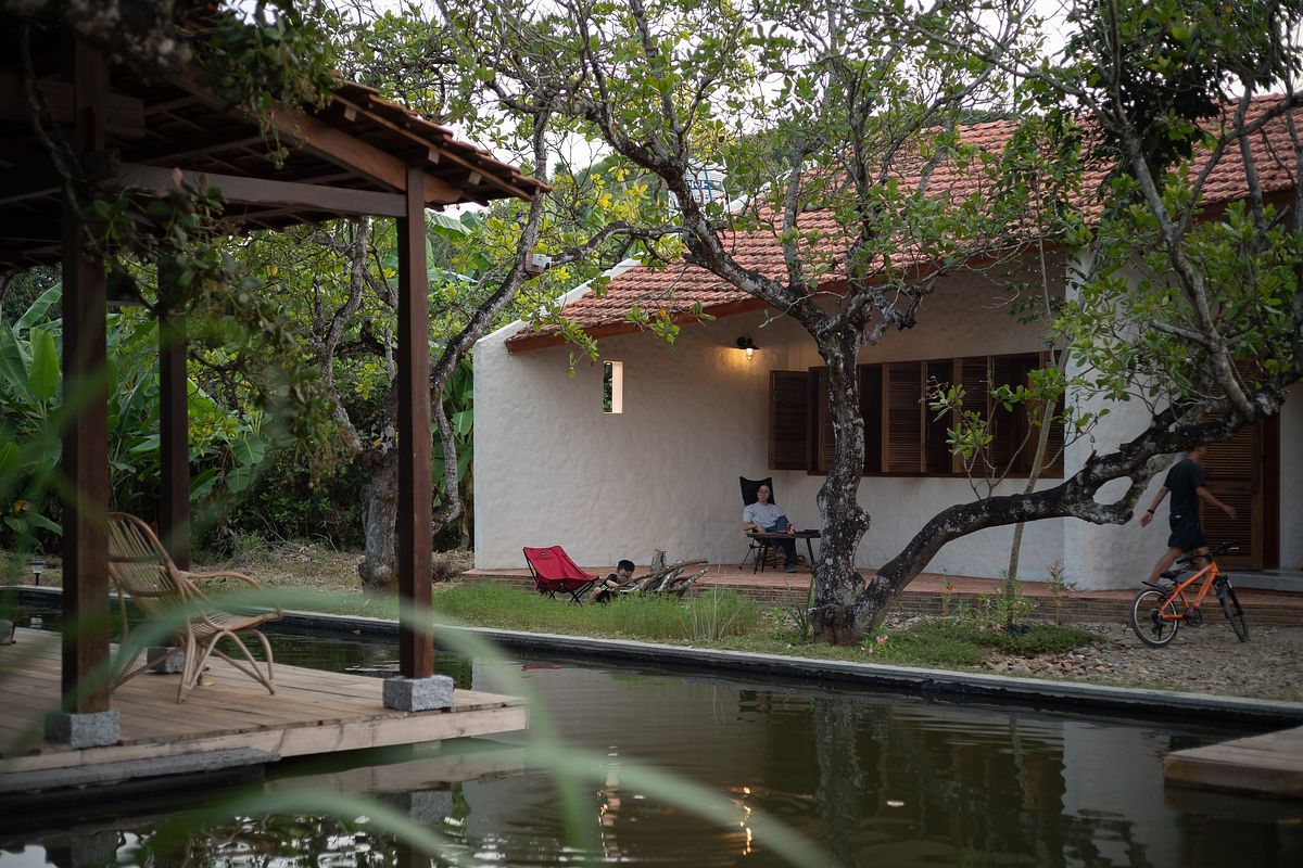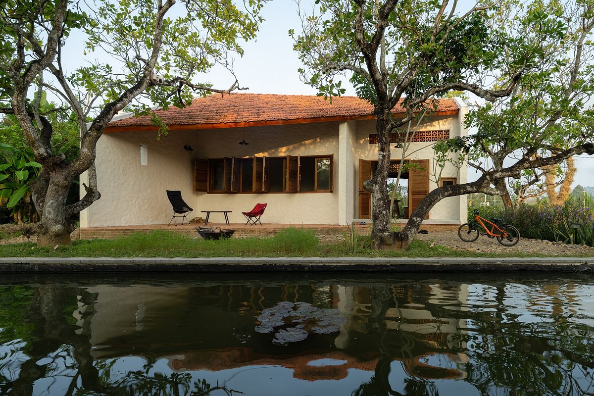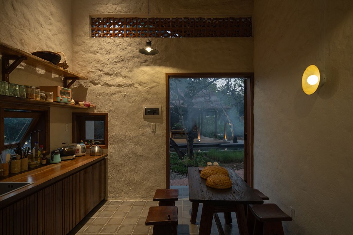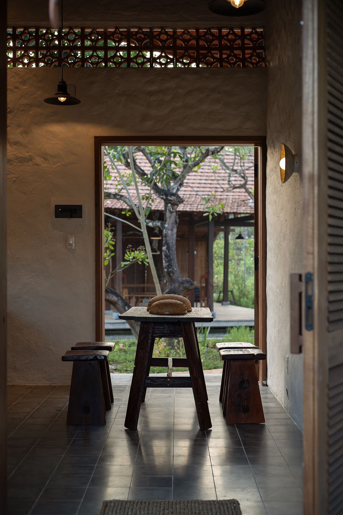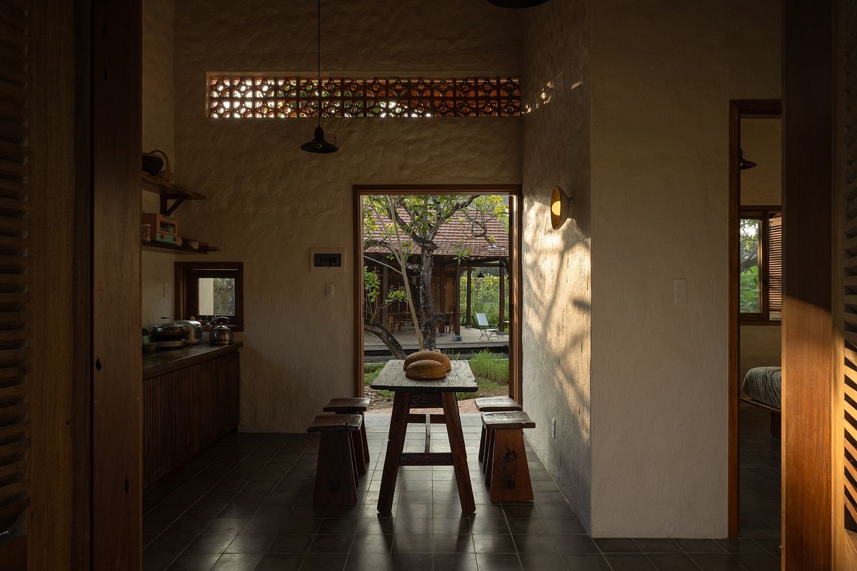 Reclaimed wood, old clay tiles, unfinished plaster, and natural stone fit the aesthetic. A lead carpenter from Bình Thuận helped ensure the integrity of the style and integrity remained intact. Moreover, an existing building frame was used for the new kitchen and dining area with the assistance of local labor. The interiors are simple, but the abundance of natural light and earthen materials makes them inviting while also discouraging insects.